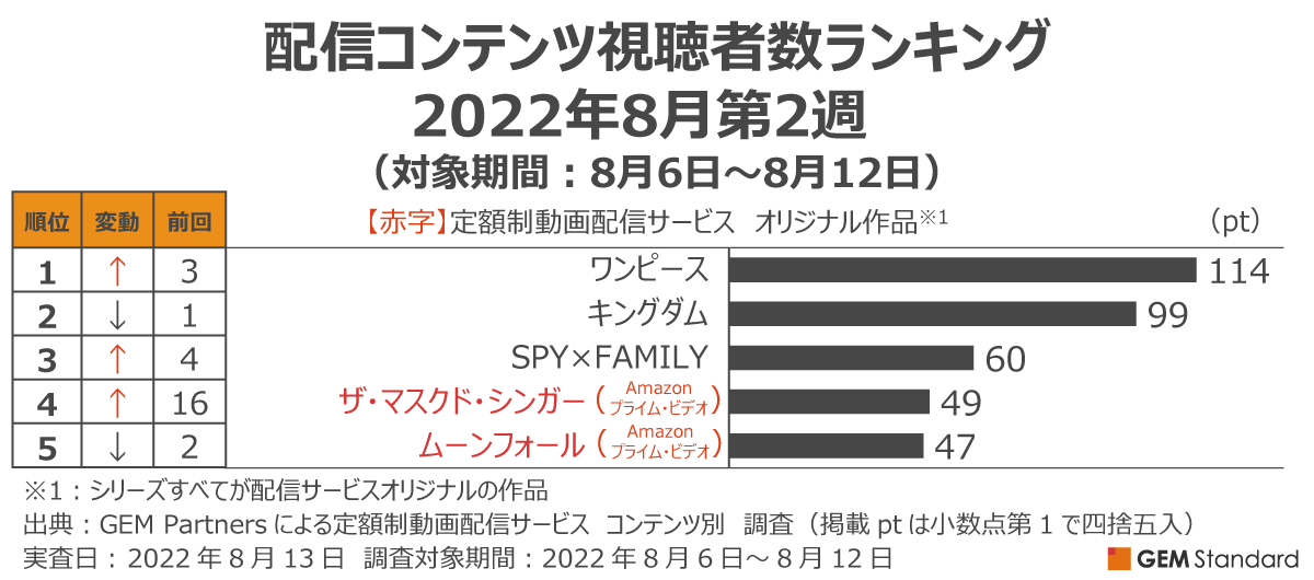 エンタテイメント業界に向けたデータ×デジタルマーケティングサービスを提供するGEM Partners株式会社(ジェムパートナーズ、所在地:東京都港区、代表取締役:梅津文)は8月19日(金)、複数の定額制動画配信サービスを横断して集計した2022年8月第2週の「配信サービス視聴者数ランキング(調査対象期間:8月6日~8月12日、調査対象:日本在住15~69歳男女)」を発表します。