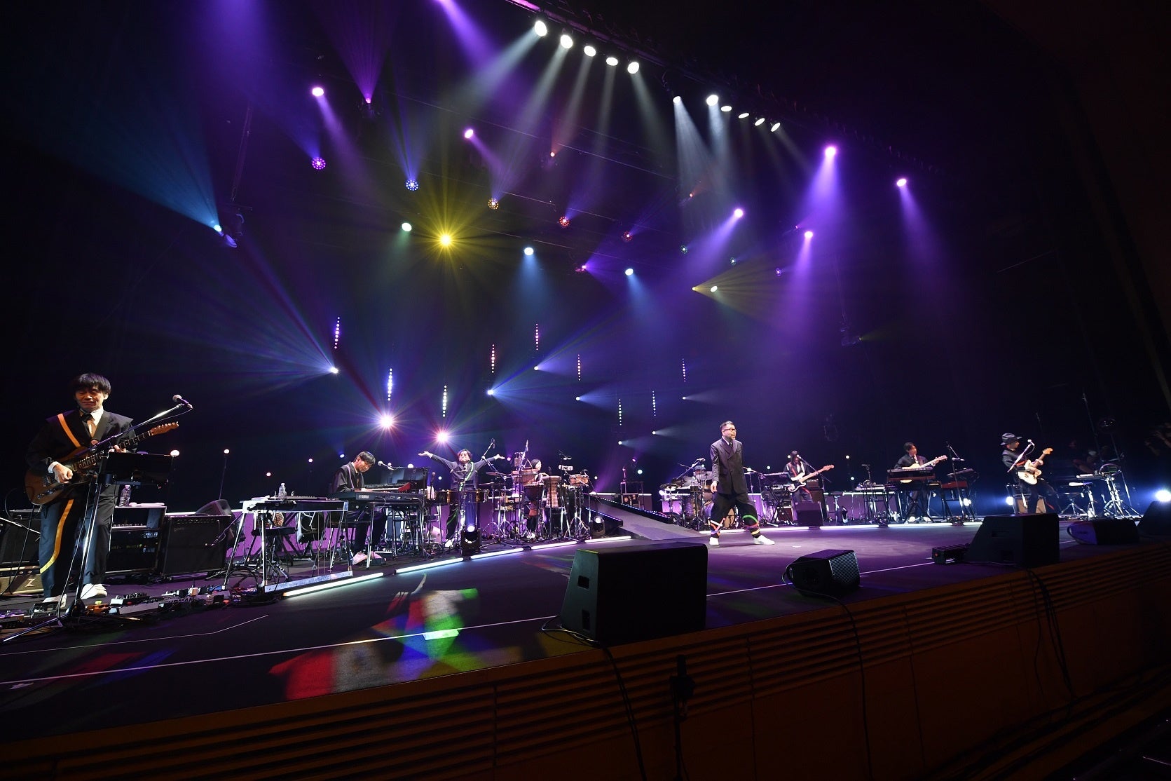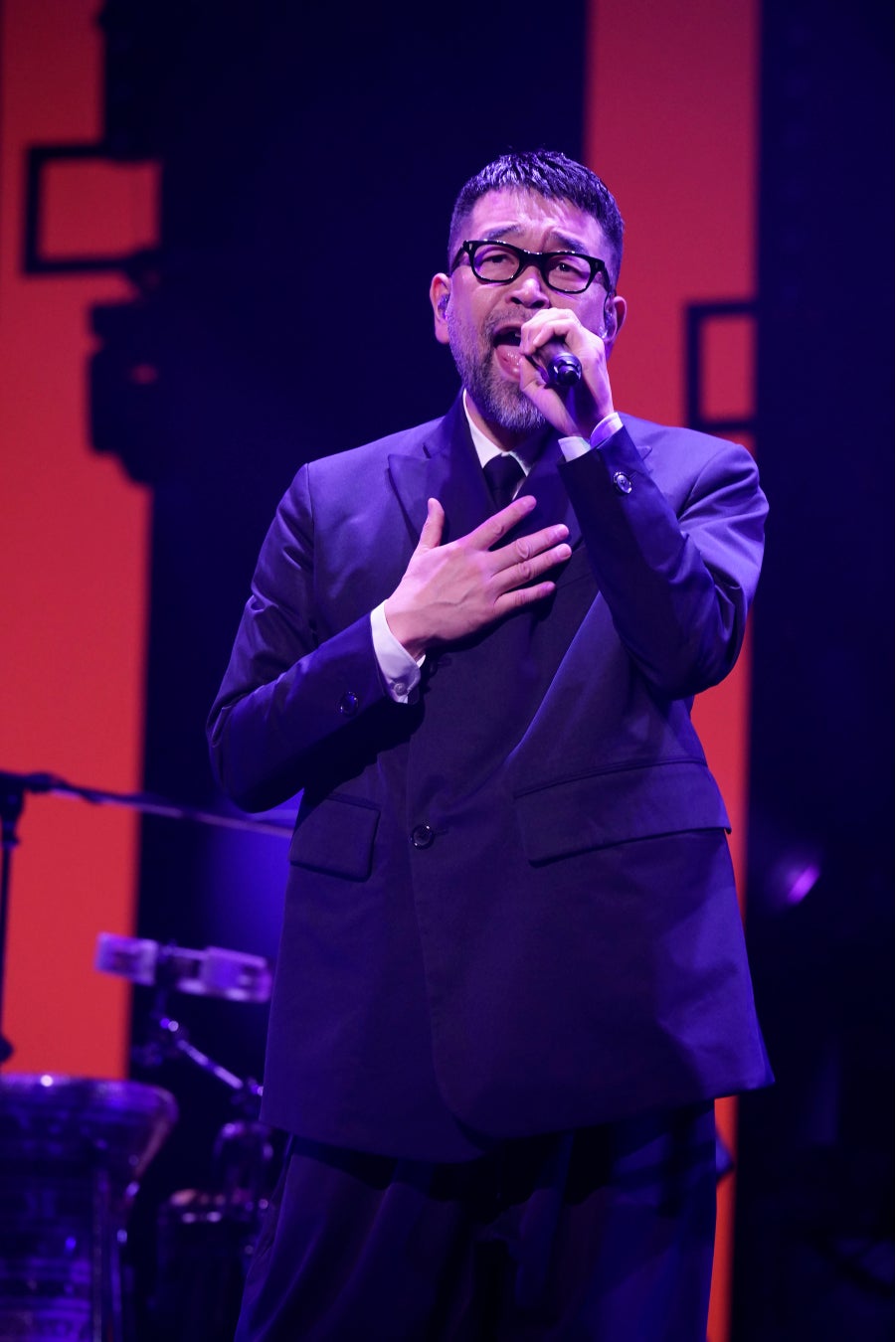 コロナ禍で自身の愛犬や、大事な友人を何人か喪った経験をもとに、〈あの頃がどんなに幸せだったか/今頃気づく〉、〈君と同じ名前がついた/悲しみと歩いて行こう〉と綴ったフォークチューン「悲しみは悲しみのままで」や、〈愛してる人に愛してることを伝えきれないようじゃ/まだまだだめかもしれない〉と歌うミドルバラード「花水木」、〈失くしたものの代わりに/手に入れたものを数えながら歩こう〉と聞き手に語りかける、マンドリンをフィーチャーした「Counting Blessing」と続くライブ中盤は思わず涙腺が緩む。「チキンライス」は言わずと知れた、ダウンタウン浜田雅功との共同名義による2004年の大ヒット曲。作詞を担当した松本人志による、ほろ苦くユーモラスな幼少期の“貧乏エピソード”がまた心を震わせる。