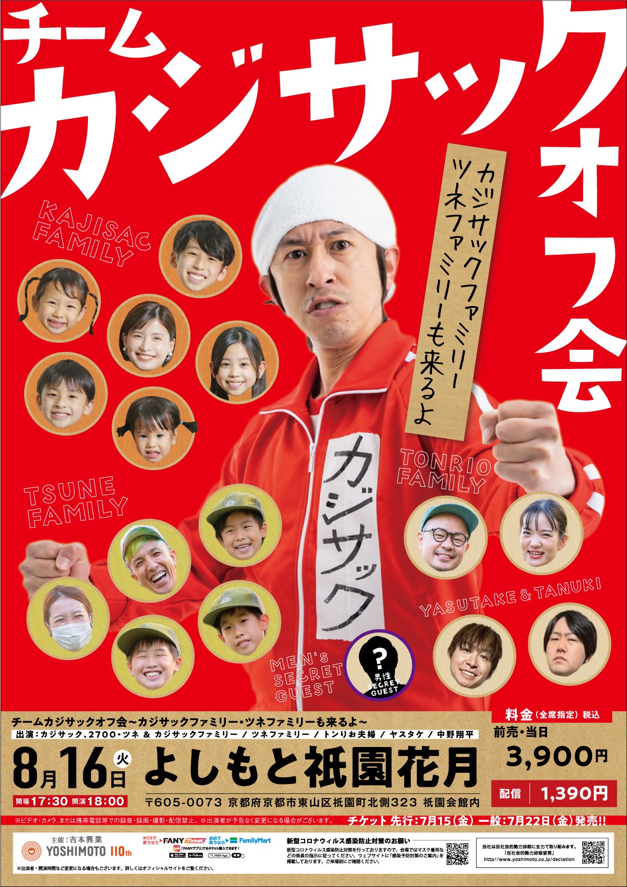 祇園花月「チームカジサックオフ会~カジサックファミリー・ツネファミリーもくるよ~」のアーカイブは8/23(火)18:00まで視聴可能(8/23(火)12:00まで購入可能)購入は下記のFANY ONLINEよりご購入下さい。
