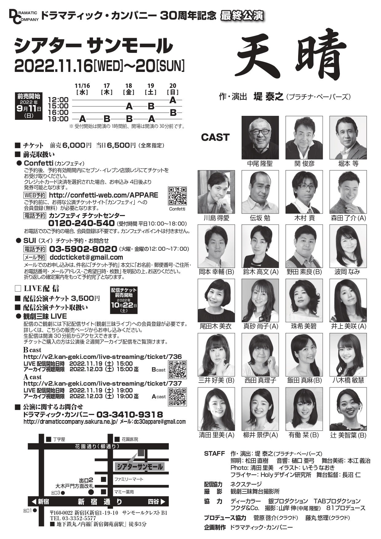 ドラマティック・カンパニー『天晴』が2022年11月16日 (水) ~2022年11月20日 (日)にシアターサンモール(東京都新宿区新宿1丁目19-10 サンモールクレストB1)にて上演されます。