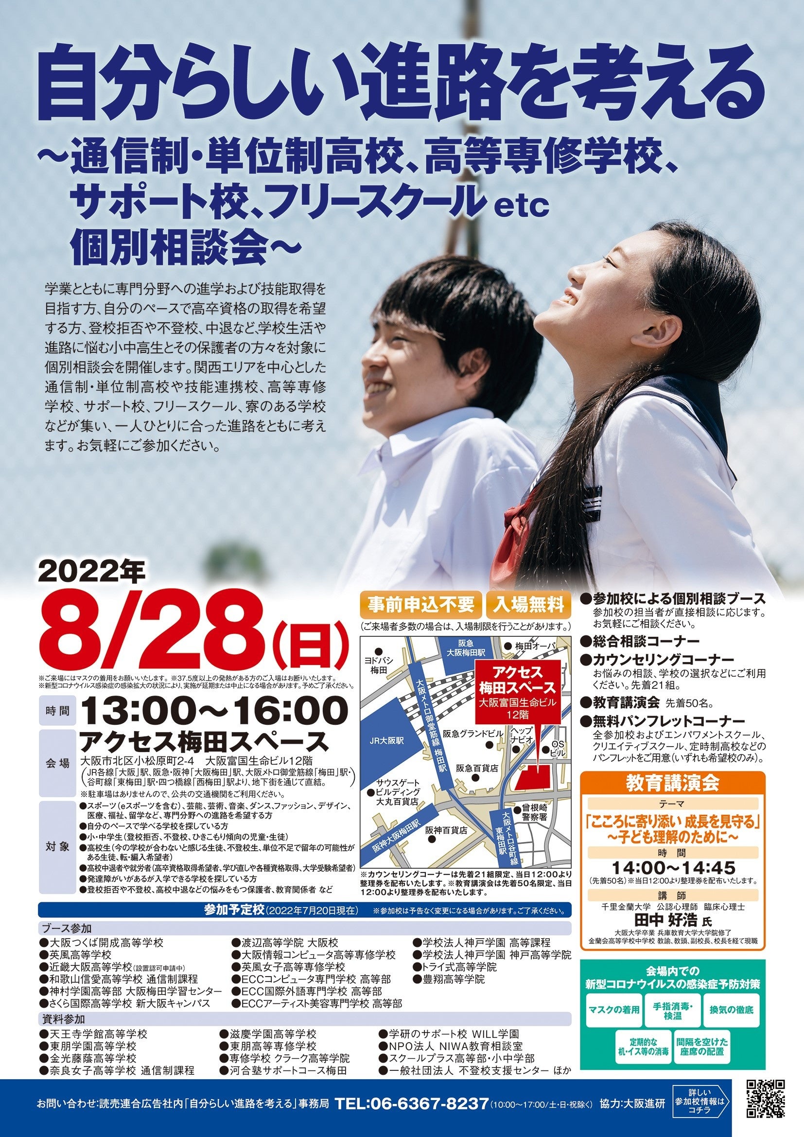 学業とともに専門分野への進学および技能取得を目指す方、自分のペースで高卒資格の取得を希望する方、登校拒否や不登校、中退など、学校生活や進路に悩む小中高生とその保護者の方々を対象に個別相談会を開催します。関西エリアを中心とした通信制・単位制高校や技能連携校、高等専修学校、サポート校、フリースクール、寮のある学校などが集い、一人ひとりに合った進路をともに考えます。お気軽にご参加ください。