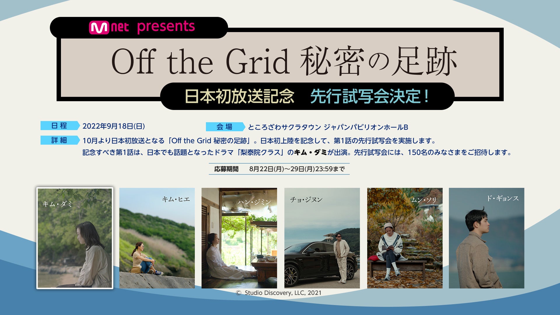 100%韓国エンターテインメントチャンネル「Mnet」および韓国エンタメ動画配信サービス「Mnet Smart+」を運営するCJ ENM Japan株式会社(本社:東京都港区、代表取締役:崔起容〔チェ・ギヨン〕)は、韓国トップ俳優たちのシネマティックロードムービー「Off the Grid 秘密の足跡」を10 月21日21:00から日本初放送・初配信いたします。また、本放送・配信に先駆けて9月18日にところざわサクラタウンにて第1話先行試写会の開催を決定いたしましたので、お知らせいたします。