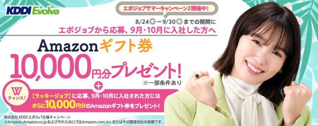 株式会社KDDIエボルバ(本社:東京都新宿区、代表取締役社長:若槻肇、以下KDDIエボルバ)は、8月24日~9月30日の期間に、BPO・コールセンター/コンタクトセンターの求人サイト「エボジョブ」から応募し、9月1日~10月31日に入社いただいた方へ最大2万円分のAmazonギフト券※1をプレゼントする「エボジョブサマーキャンペーン2」を全国で実施いたします。