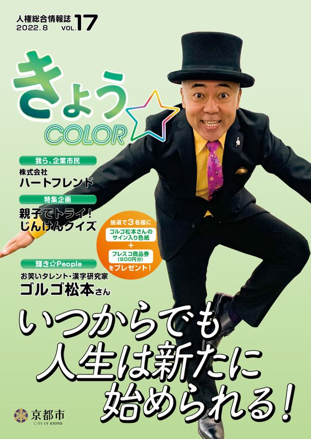体を使って「命」の一文字を表現するネタでおなじみの、ゴルゴ松本さんのインタビューを掲載。平成23年から全国各地の少年院・女子少年院を訪れ、再犯防止に向けて「『命』の授業」と題した講演活動をされています。その取組にかける熱い思いを語っていただきました。