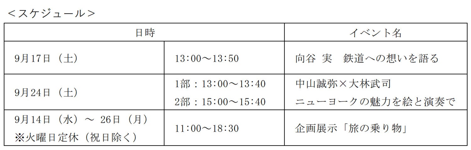 ※「向谷 実 鉄道への想いを語る」「中山誠弥×大林武司 ニューヨークの魅力を絵と演奏で」はいずれも予約が必要です。