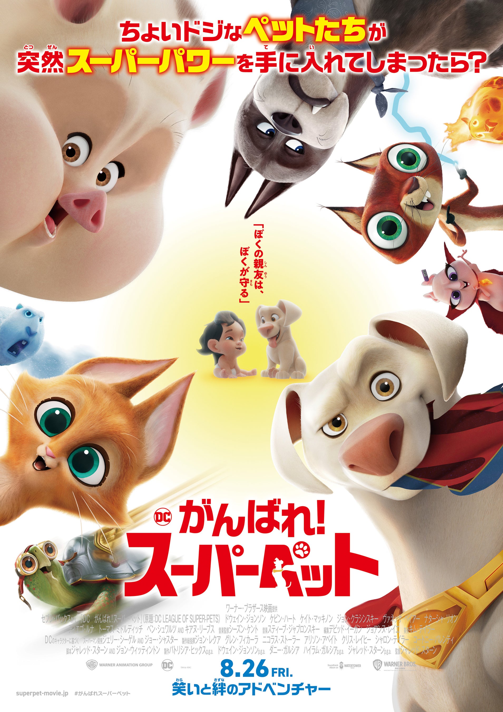 世界中から愛される「トムとジェリー」のワーナー・ブラザースが贈る、笑いと絆のアドベンチャー!!可愛いペットたちが、突然スーパーパワーを手に入れたら・・・!?急にはパワーを操れないちょっとドジなペットの犬、ブタ、カメ、リスたち。世界征服を狙うあざと可愛い子猫とモルモットたちにさらわれた仲間のご主人様を救い出すため、最強の敵に立ち向かう!この夏、ペットたちの”誰も見たことのないスーパーパワー”と可愛さとユーモアが炸裂する、未知なる大冒険に飛び出そう!2022年8月26日(金)より全国ロードショー。