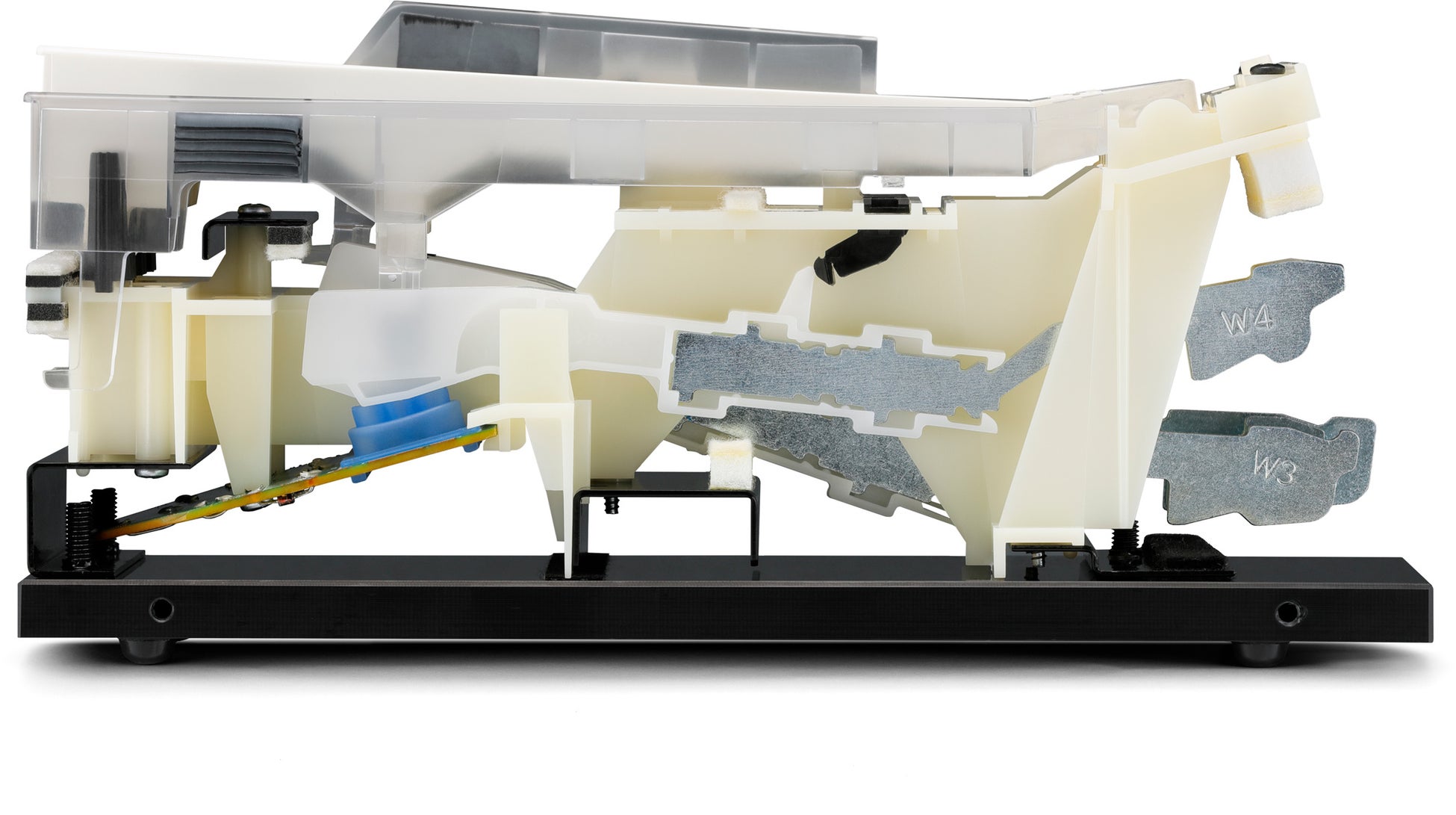 RHⅢ鍵盤は、グランドピアノの弾き応えを再現するため、細部までこだわって開発した鍵盤です。カワイ独自の静音構造をブラッシュアップして、吸収力の高いクッションを鍵盤の各部に配置し、鍵盤が動く時に生じるコトコト音を抑制しています。ピアノ音がきれいに響くため、快適に演奏できます。