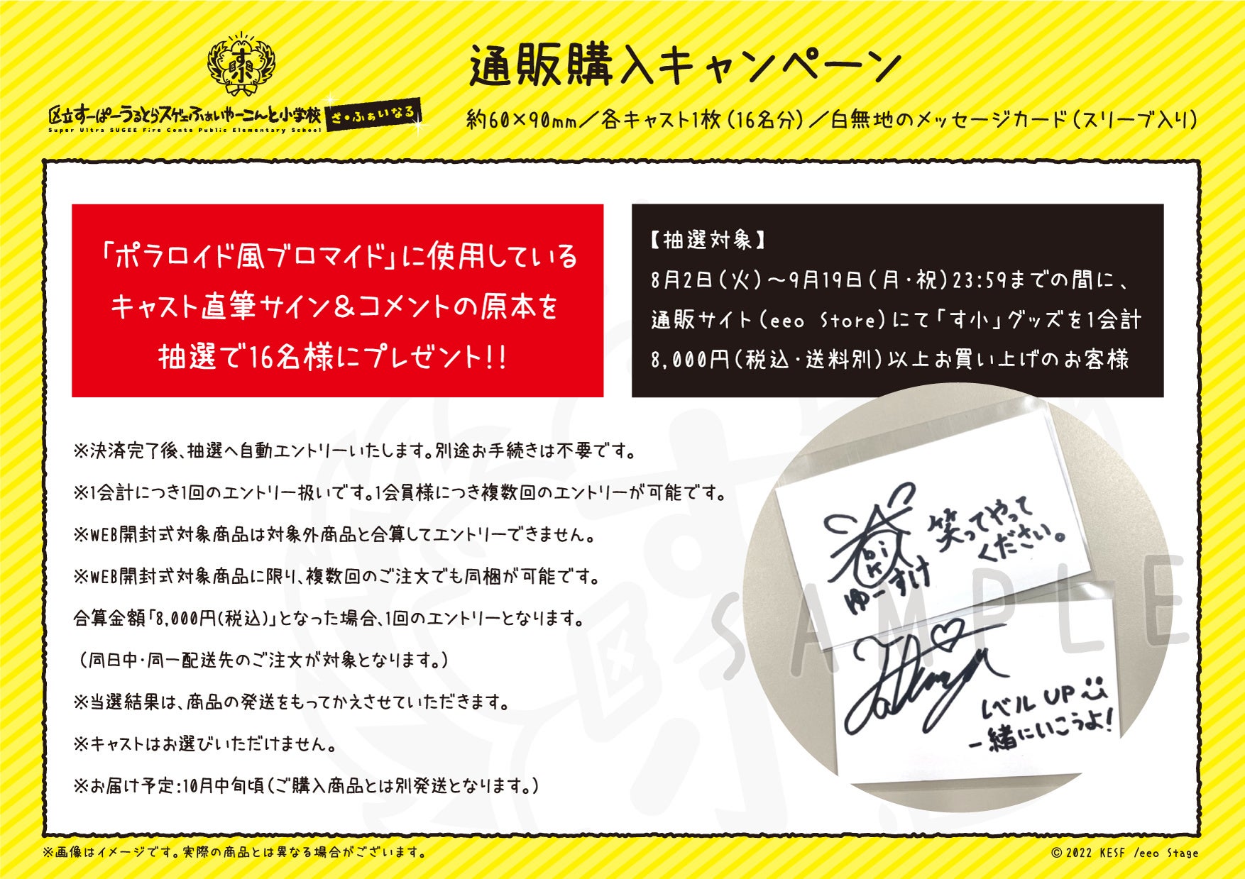 通販サイト(eeo Store)にて「す小」グッズを1会計8,000円(税込・送料別)以上お買い上げのお客様に「ポラロイド風ブロマイド」に使用しているキャスト直筆サイン&コメントの原本を抽選で16名様にプレゼントいたします。(1会計につき1回のエントリー扱いです。)