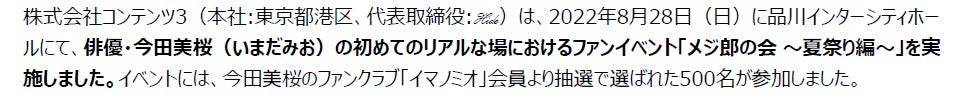 今回、今田美桜初めてのオフライン開催となるファンイベントでは、 今田美桜の素顔を明らかにし、ファン・「メジ郎」との交流を深めるコーナーを実施いたしました。また、当日参加した「メジ郎」には、8月29日(月)より、今田美桜初めての試みとして、オフラインイベント開催記念のNFTが順次プレゼントされます。