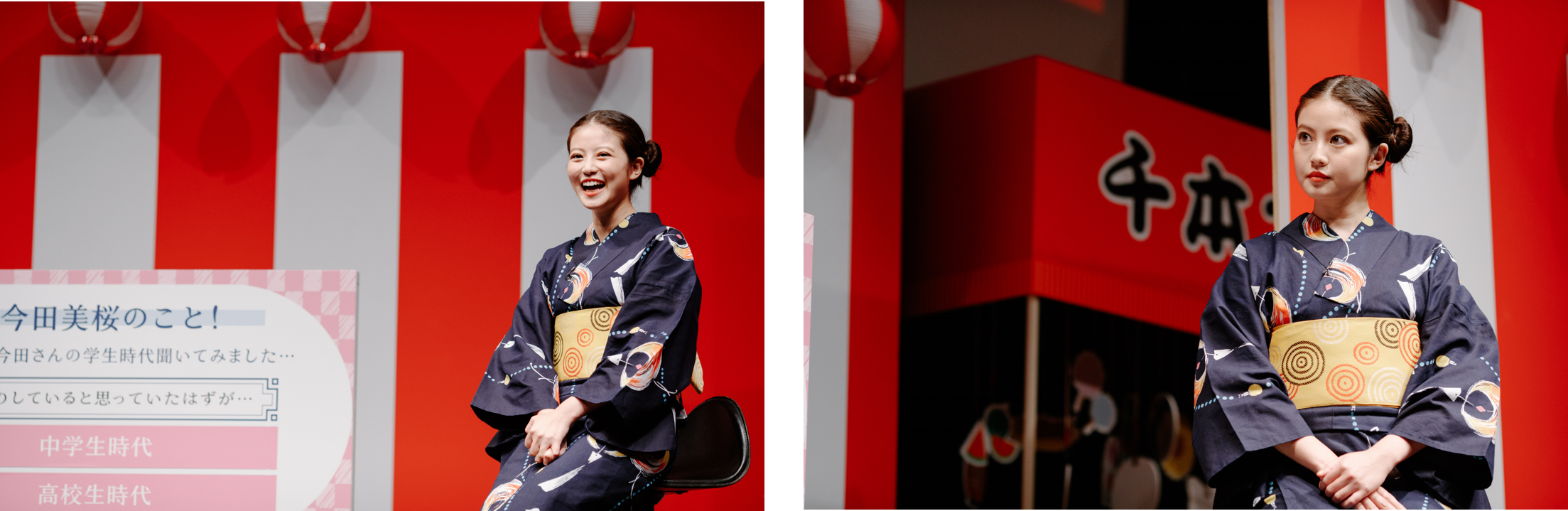 「メジ郎の会~夏祭り編~」というイベント名にぴったりな、屋台をイメージした舞台に登場した今田美桜は、Twitterのファン投票によって選ばれた夏らしい浴衣姿で登場! 同じ高校出身のMCの刈川くるみさんより、今田が学校に来ると皆が窓に駆け寄っていたと高校時代からの人気ぶりが分かるエピソードが語られ、会話が盛り上がりながらイベントがスタートしました。ファンネームである「メジ郎」の由来について、