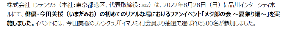 今回、今田美桜初めてのオフライン開催となるファンイベントでは、 今田美桜の素顔を明らかにし、ファン・「メジ郎」との交流を深めるコーナーを実施いたしました。また、当日参加した「メジ郎」には、8月29日(月)より、今田美桜初めての試みとして、オフラインイベント開催記念のNFTが順次プレゼントされます。