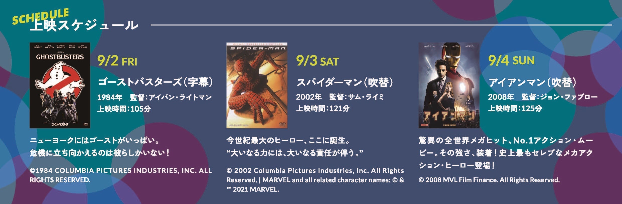 立川シネマシティ協力の下、不朽の名作である「ゴーストバスターズ」、「スパイダーマン」、「アイアンマン」を上映します。夜空の下で見る、いつもとは一味違う映画体験をお楽しみください。