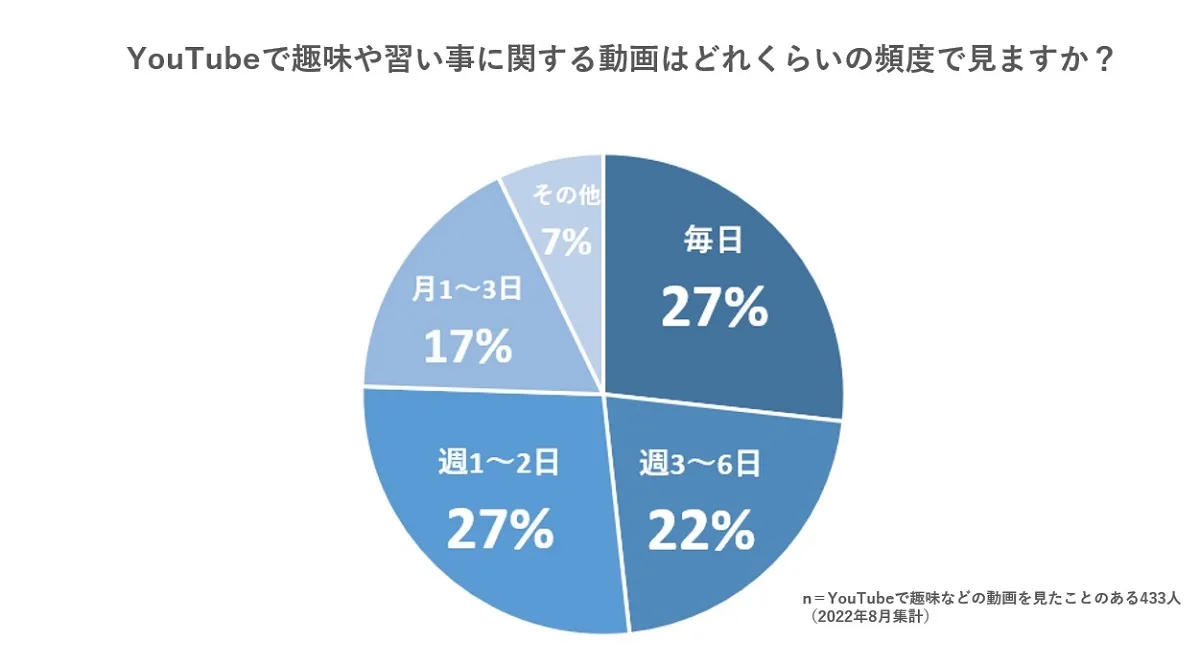 YouTubeで趣味や習い事に関する動画を視聴している人の内、約3割の人が毎日、約5割の人が週3日以上の高い頻度で、趣味や習い事の動画を視聴している。
