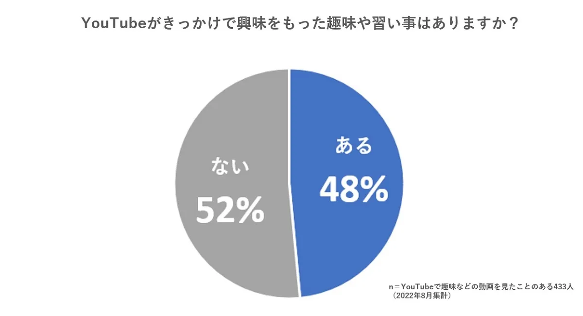 - 約5割の人がYouTubeがきっかけで興味をもった新しい趣味や習い事がある