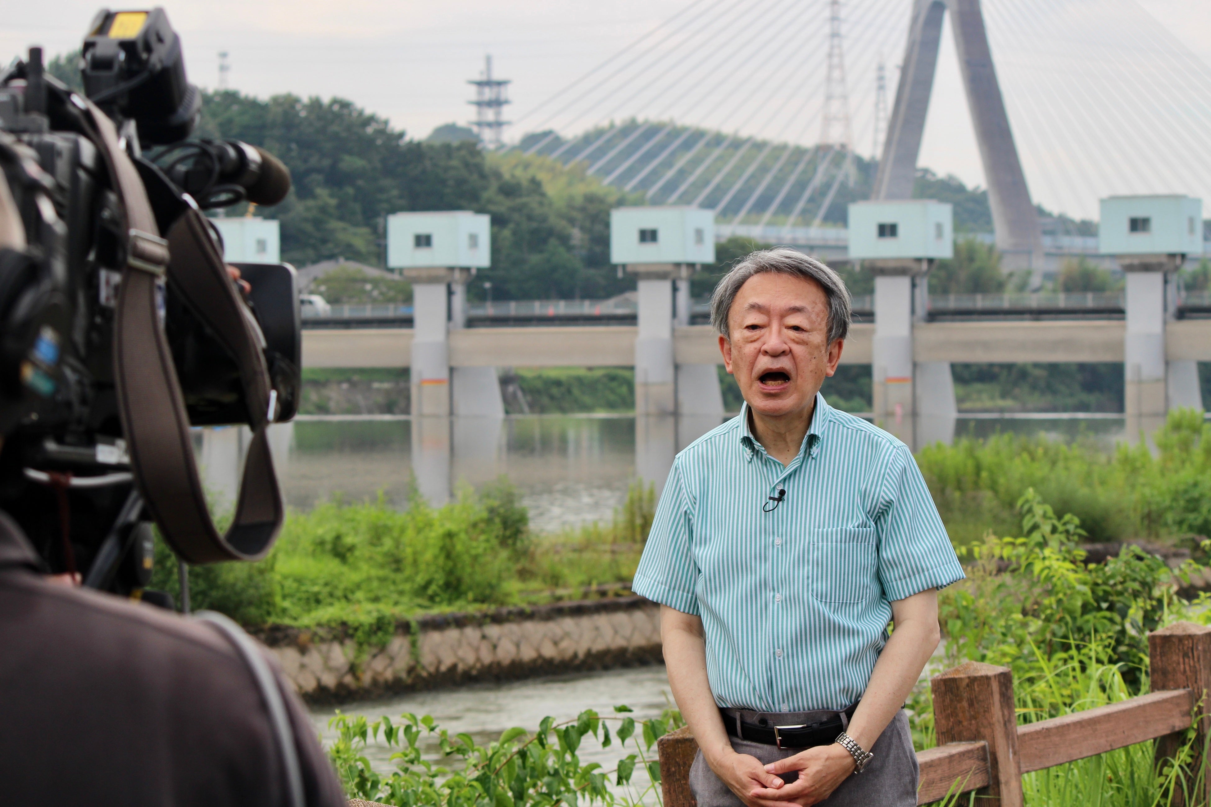 (明治用水頭首工を取材する池上彰氏と石神愛子アナウンサー 16日)