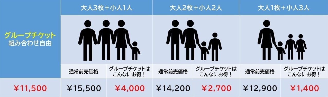 「グループチケット」では、11500円で4名が入場可能になりますので(通常は大人4200円、小人(4歳~小学生)2900円)、大人2人、子供2人だと2700円もお得になります。