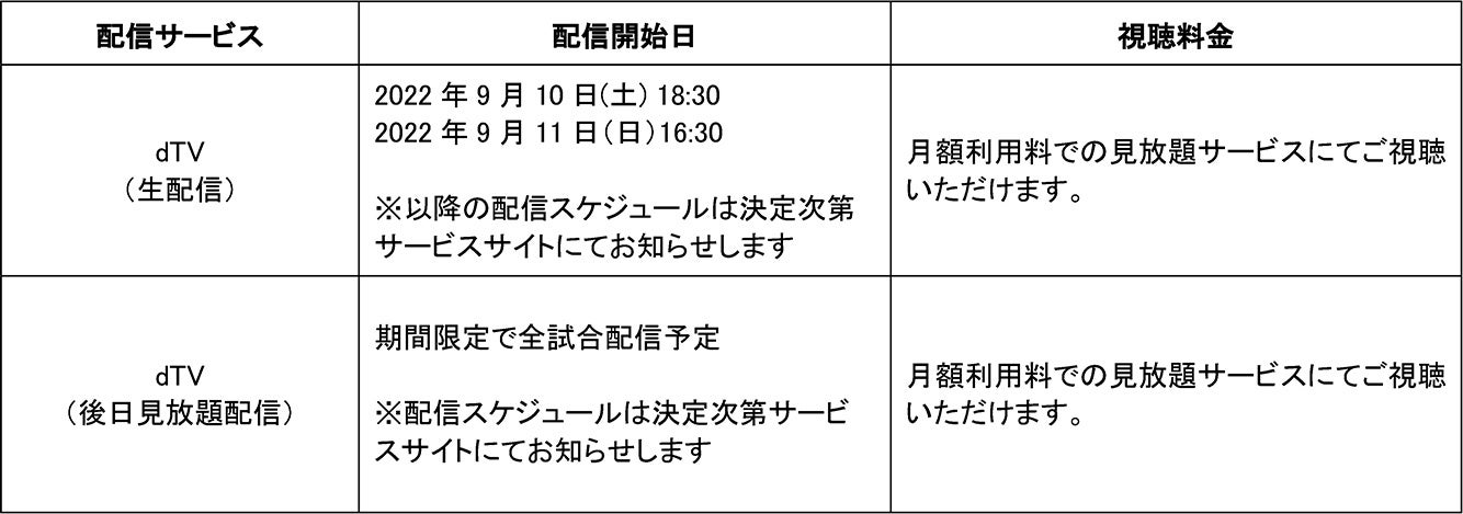 なお、開幕の2022年9月10日(土)と9月11日(日)の各第2試合目はdTVでも生配信します。