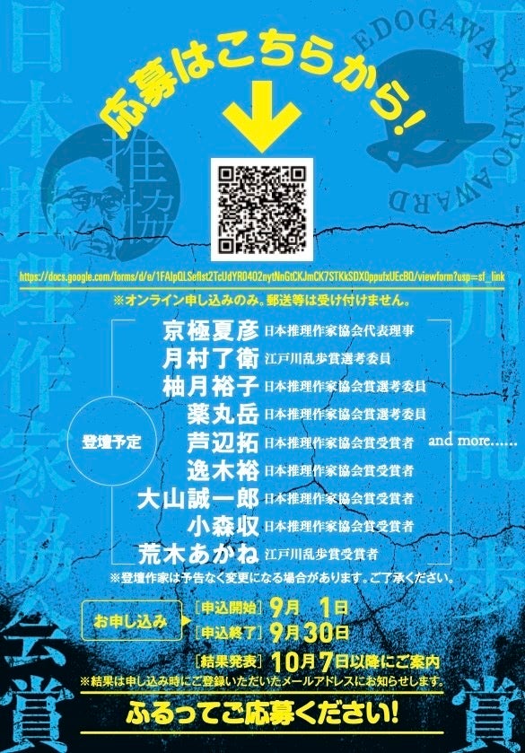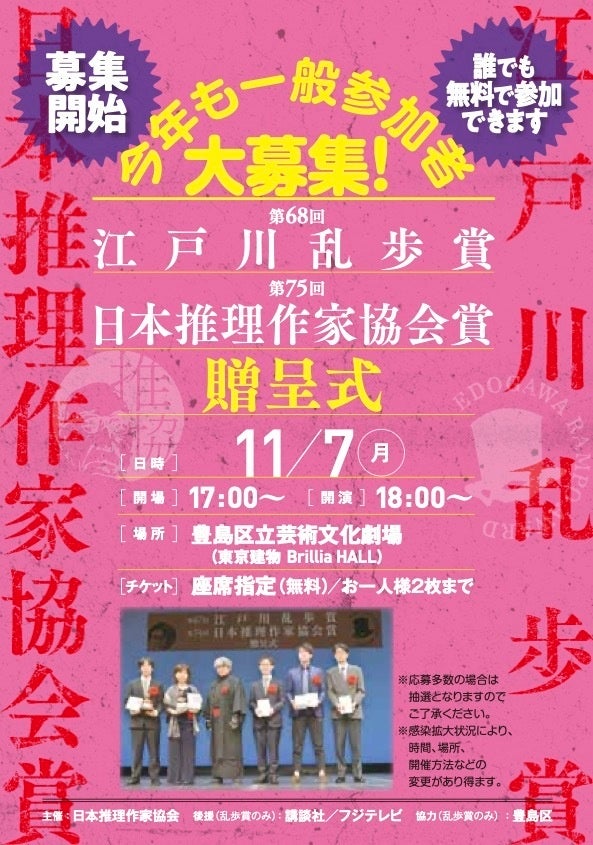 江戸川乱歩賞(主催:日本推理作家協会/後援:株式会社講談社・株式会社フジテレビジョン/協力:豊島区)と、日本推理作家協会賞(主催:日本推理作家協会)の贈呈式が11月7日(月)午後6時00分より開催されます。初公開だった昨年度は参加希望者多数のため抽選となった人気イベントです。