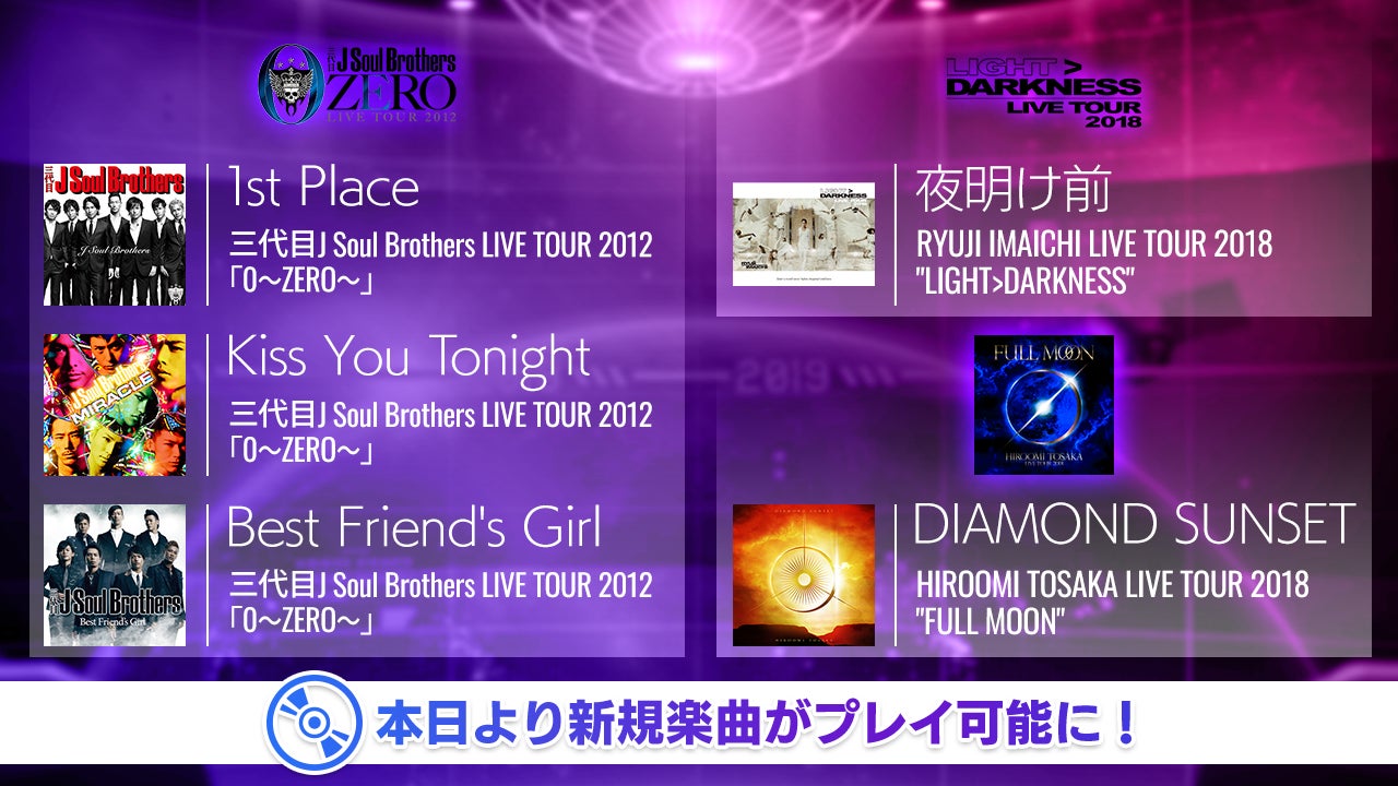 本日2022年9月1日(木) 15時から三代目 J Soul Brothers LIVE TOUR 2012「0〜ZERO〜」の楽曲が3曲、HIROOMI TOSAKA LIVE TOUR 2018 『FULL MOON』、RYUJI IMAICHI LIVE TOUR 2018 『LIGHT>DARKNESS』から各1曲がプレイ可能となっております。