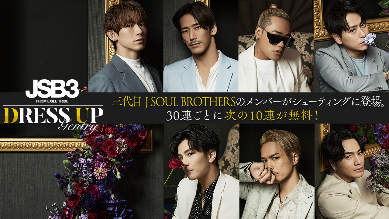 2022年8月31日(水)よりステップアップシューティング三代目 J SOUL BROTHERS【Dress UP Gentry】、THE RAMPAGE【Dress UP Gentry】Vol.1を開催中です。今回のシューティングは30連ごとに次の10連シューティングが無料になる特別な仕様となっております。