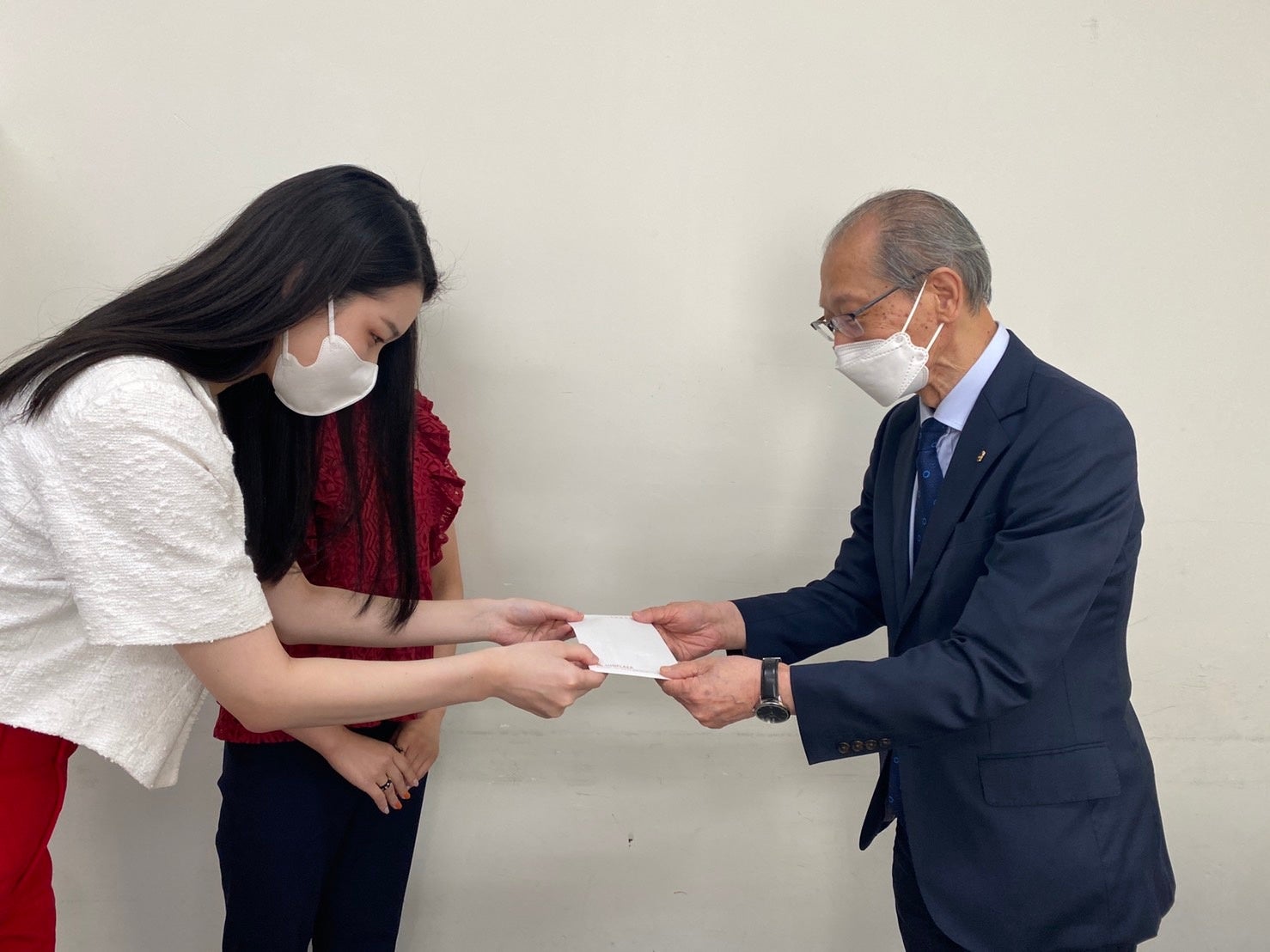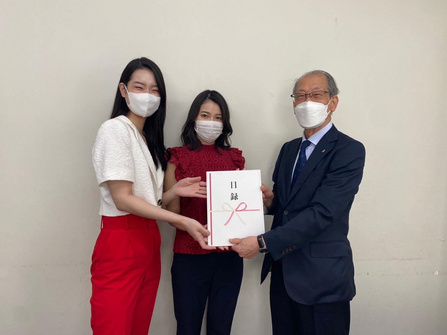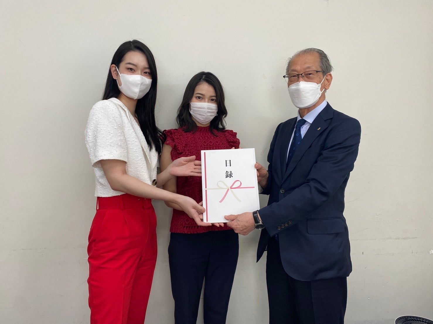 2人が出場したミスユニバーシティ2021日本大会のファイナリスト19名で集めた寄付金を目録にし、一般社団法人日本いのちの電話連盟 副理事長の金子圭賢氏へ贈呈した。