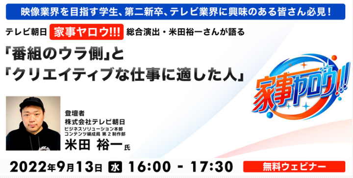 株式会社クリーク・アンド・リバー社(C&R社)は9月13日(火)、映像・テレビ業界にご興味をお持ちの大学・大学院・専門学校に通う学生や第二新卒の方々を対象に、無料のオンラインセミナー「テレビ朝日『家事ヤロウ!!!』総合演出 米田裕一さんが語る『番組のウラ側』と『クリエイティブな仕事に適した人』」を開催いたします。