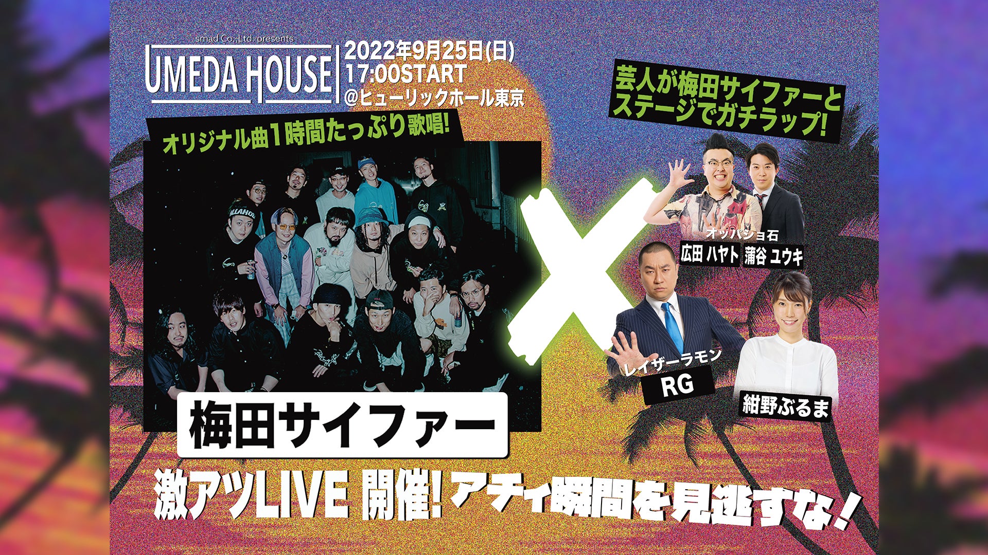 2022年9月25日(日)にヒューリックホール東京にて開催する、大阪・梅田発のサイファー集団“梅田サイファー”とラッパー芸人たちによるコラボイベントsmad Co.,Ltd.Presents「UMEDA HOUSE」の一般発売前最後の先着先行が9月2日(金)11:00からスタートした。