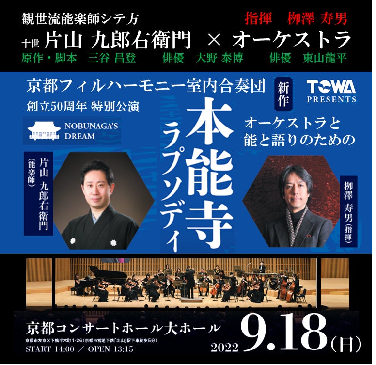 9月18日新作発表。光秀はなぜ信長を裏切らねばならなかったのか?オーケストラで古都京都の魅力を発見するシリーズ第一弾。創立50周年を迎えたユニークな室内オーケストラ京都フィルハーモニー室内合奏団が、50周年を記念して新作を発表します。