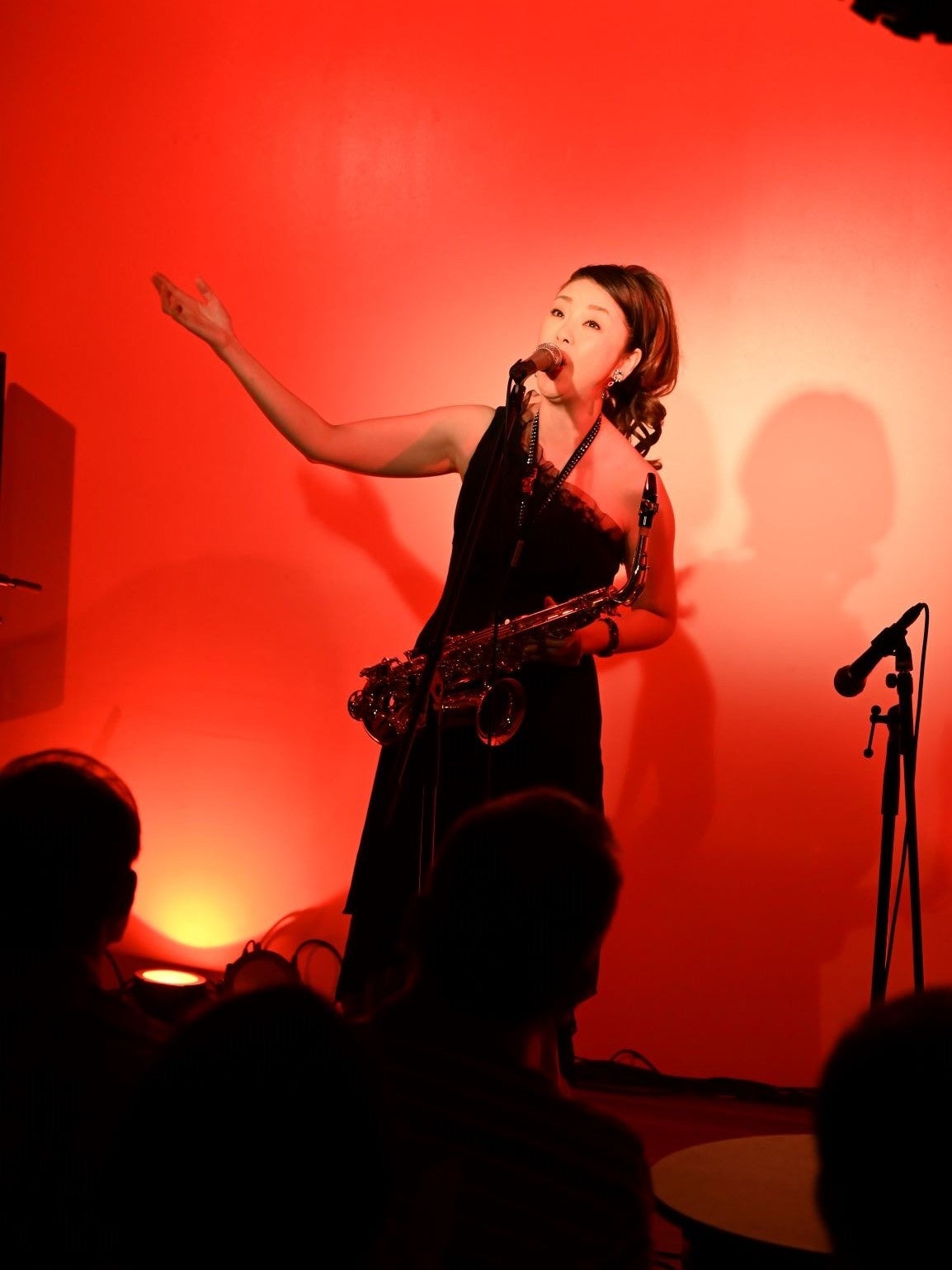 更には「真赤な太陽」(美空ひばり)と「コーヒー・ルンバ」を得意のサックス演奏を交えて熱く歌い上げて会場をヒートアップさせていった。