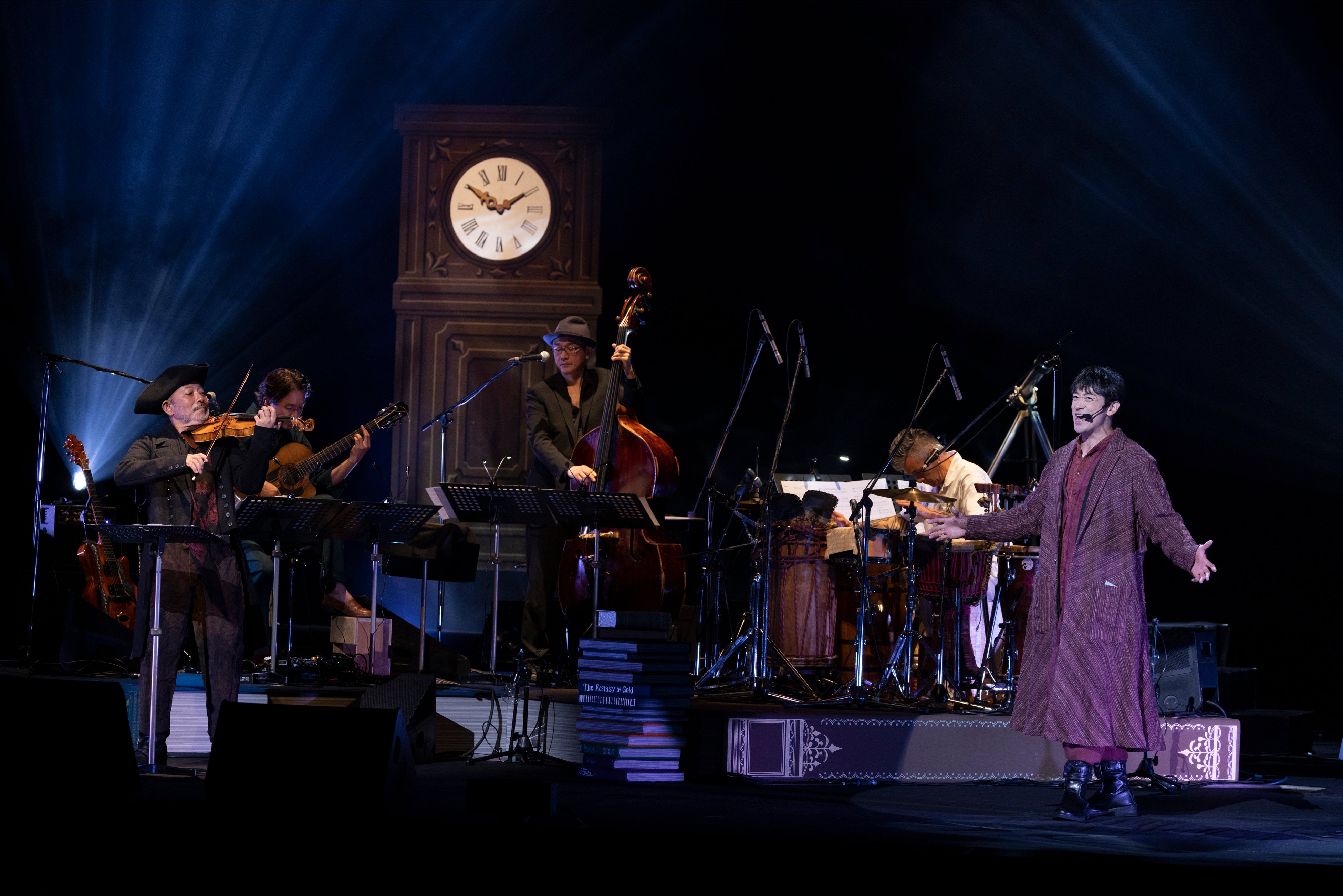 初日の東京公演。オープニングでは、大時計や天体望遠鏡、本棚などが置かれた不思議な雰囲気の中、本棚の魔導書が光り、ひとりでに開いて、謎めいたスモークが空間に漂う。すると、本の世界の登場人物たちである古澤ら演奏者たちが登場し、謎めいた魅惑的な雰囲気のまま1曲目の「What can we do?」を奏でる。