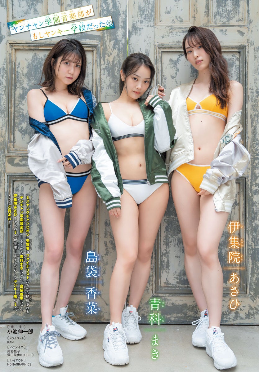 センターグラビアには「ヤンチャン学園音楽部」より青科まきちゃん、島袋香菜ちゃん、伊集院あさひちゃんが登場。それぞれのイメージカラーのスカジャンを纏い、グラビアのテーマである「ヤンチャン学園がもしヤンキー学校だったら」を可憐に魅せてくれます。