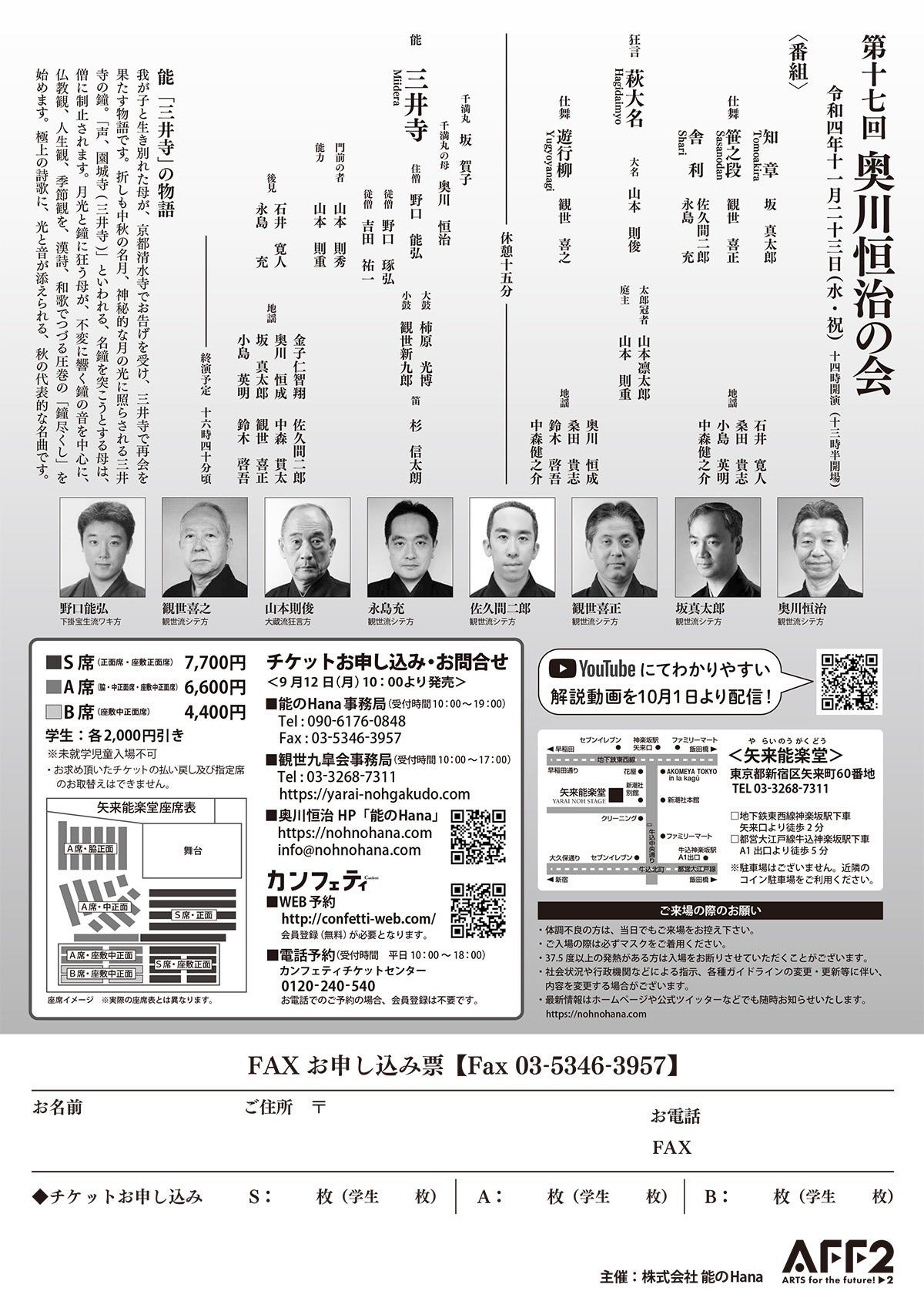 株式会社能のHana主催、第17回奥川恒治の会「三井寺」が2022年11月23日 (水・祝)に矢来能楽堂(東京都新宿区矢来町60)にて上演されます。