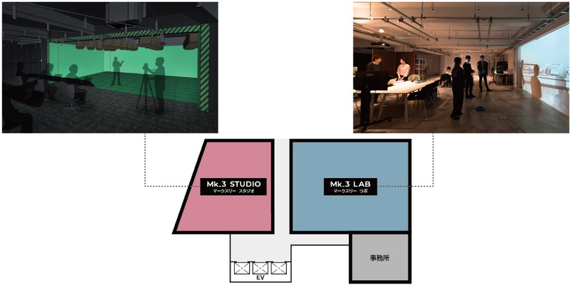 『港南ラボ マークスリー[Mk_3]』は、2018年5月より使用しているエリアを『マークスリー ラボ[Mk_3 LAB]』、今回の増床エリアを『マークスリー スタジオ[Mk_3 STUDIO]』と名づけ、バーチャルとの連携を念頭に、新たに「配信・収録」「実験・シミュレーション」「展示イベント」等のより幅広い活用が可能な拠点として構築します。