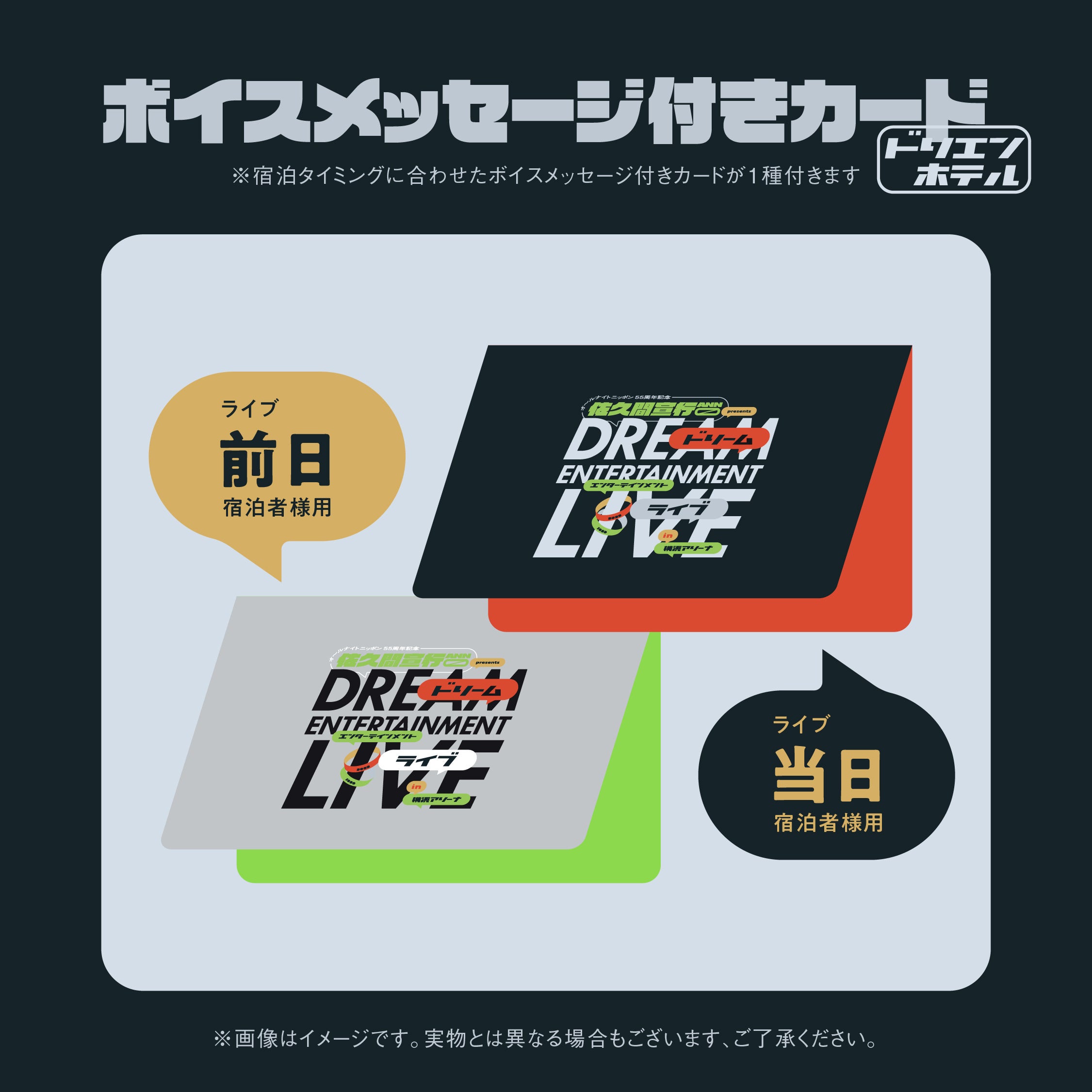 ライブ前日に宿泊する10月28日泊と、ライブ終了後に宿泊する10月29日泊の2つのプランを近畿日本ツーリストコーポレートビジネス(※1)の協力にて用意しました。ライブ前日に宿泊して新横浜近郊を散策したり、ライブ終了後に宿泊して参加者同士のライブの打ち上げをするなど、当日だけではなくライブ前後も楽しんでいただける企画です。宿泊者限定スペシャルグッズは、歯ブラシやアイマスクなどホテルコラボに因んだラインアップを用意。「ボイスメッセージ付きカード」はライブ前日、ライブ終了後で別のメッセージをお楽しみいただけます。
