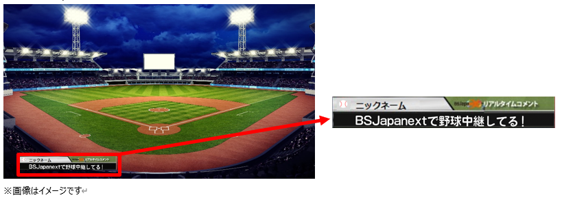 試合中、テレビの前の視聴者のみなさまから公式アプリ「つながるジャパネット」によせていただく応援コメントをテレビの画面下にリアルタイムで表示していきます。両球団への応援はもちろん、特別ゲストへの質問もどしどしお寄せください!コメントは公式アプリからのみ受付となります(公式アプリでの配信はありません)