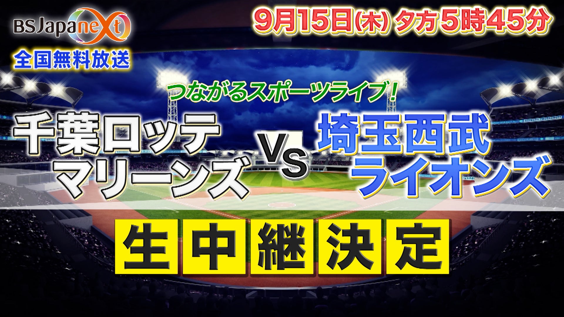 株式会社ジャパネットブロードキャスティングが3月に開局した無料のBS放送局『BSJapanext』(読み:ビーエスジャパネクスト)にて2022年9月15日(木)、「BSJapanextつながるスポーツライブ!プロ野球 パ・リーグ『千葉ロッテマリーンズ vs 埼玉西武ライオンズ』」の試合放映が決定したことをお知らせします。放送開始は、夕方5時45分を予定しております。