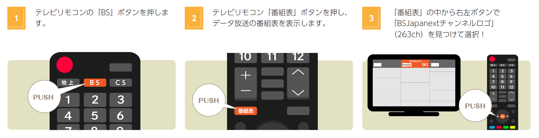 ③「番組表」の中から左右ボタンで 「BSJapanextチャンネルロゴ」(263ch)を見つけて選択