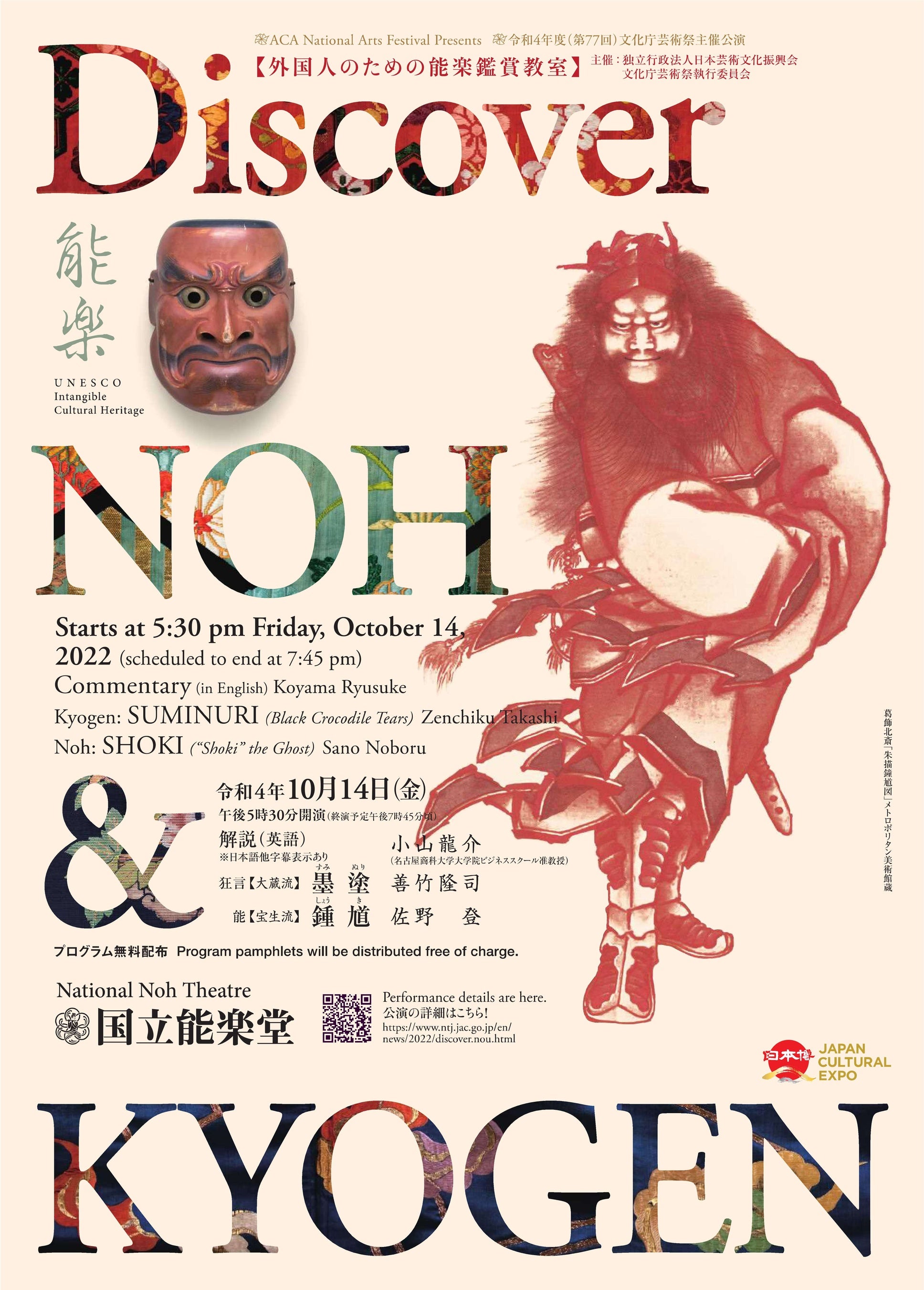10月外国人のための能楽鑑賞教室 Discover NOH & KYOGEN 英語による解説・墨塗・鍾馗 / 2022年10月14日(金)午後5時30開演