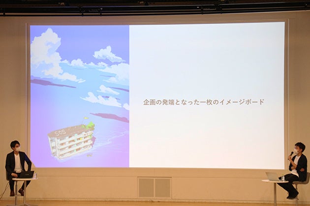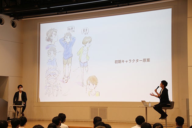 まずは同作の制作舞台裏を教えていただきました。石田祐康監督が描いたイメージボードやキャラクター原案、制作フローから最終カットを仕上げるまでの細かなこだわりまで、貴重な資料を紹介しながら、アニメ映画の制作現場の様子を詳しく説明いただきました。