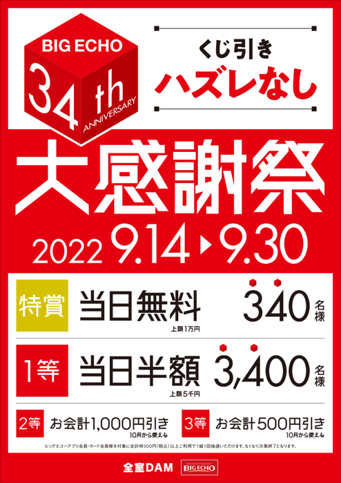 株式会社第一興商は、カラオケルームビッグエコー34周年を記念して、全店舗にて「ビッグエコー34周年大感謝祭」を2022年9月14日より開催します。