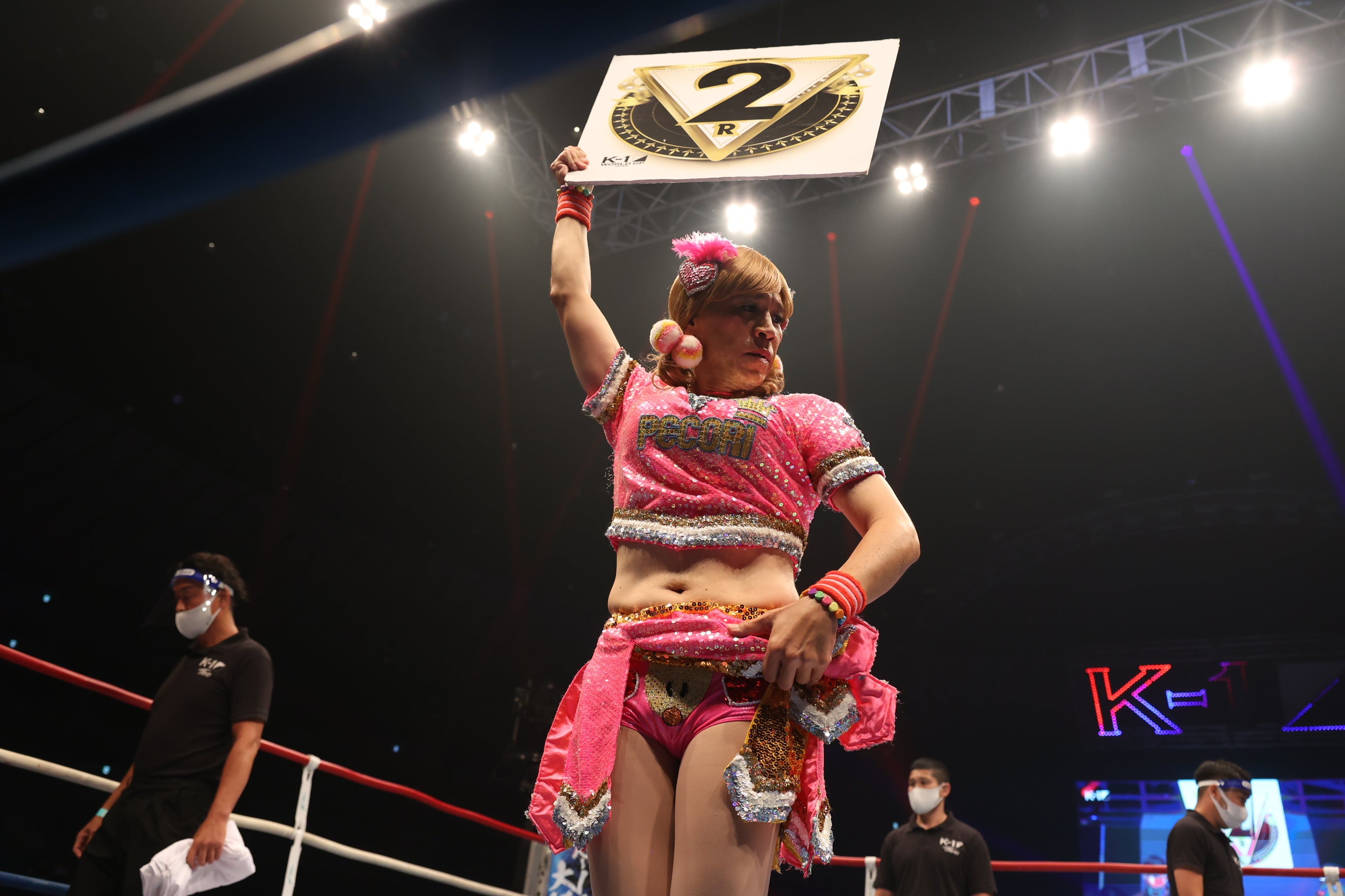 フジテレビの伝説的コント番組『ワンナイR&R』から誕生した、ガレッジセール・ゴリさん扮する「ゴリエ」ちゃんには、第8試合 [K-1スーパー・ライト級/3分3R・延長1R]不可思vs大野祐志郎の一戦(不可思選手が3ラウンド 02:47 KO勝ち)にて、『Pecori Night』でチアダンスの披露と共に、K-1スペシャルラウンドガールとして初登場いただきました。