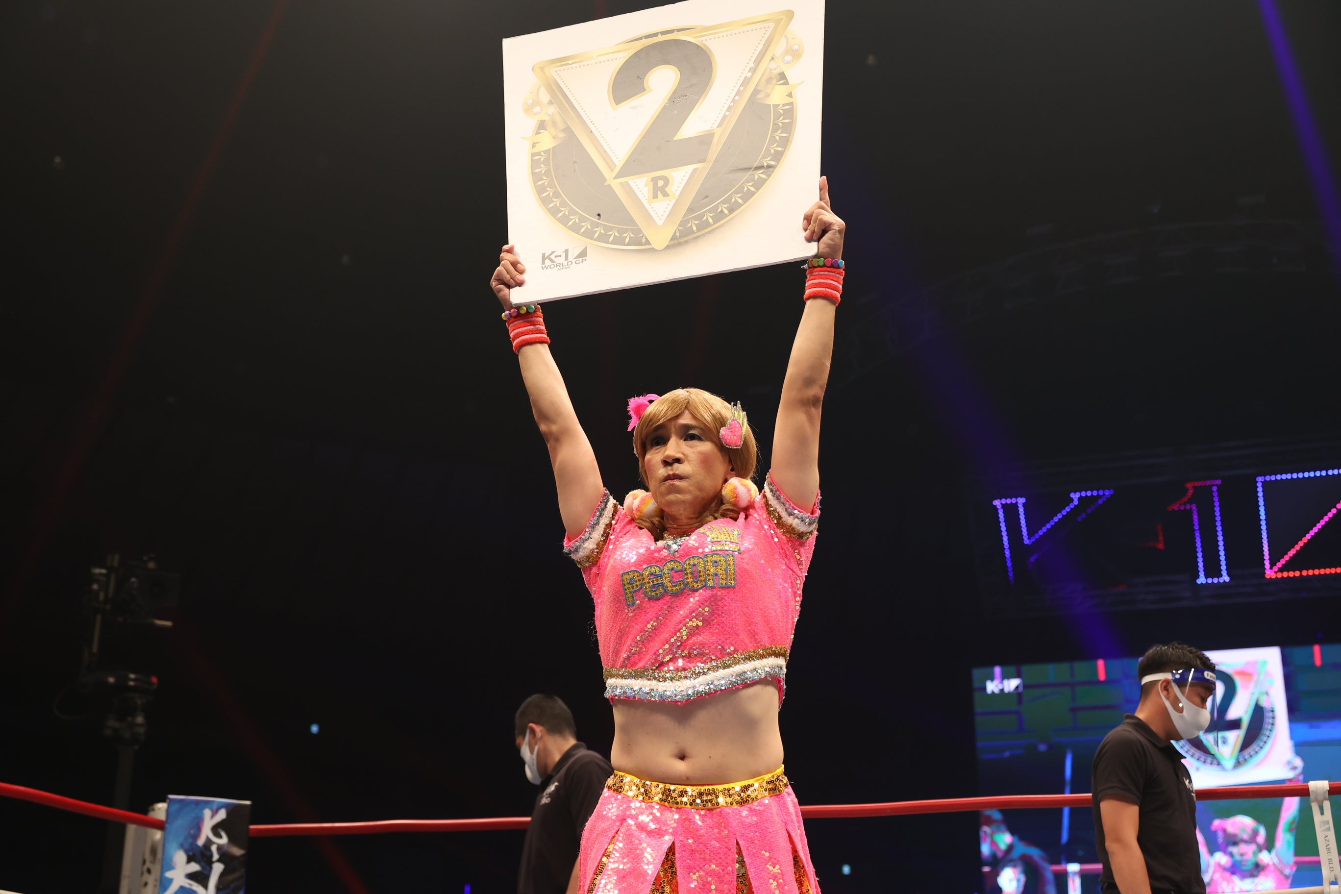 こちらの大会のK-1スペシャルラウンドガールに「ゴリエ」ちゃんが初挑戦しました。大ヒット曲『Pecori Night』に乗せて入場し、チアダンスで選手らにエールを贈り、会場を盛り上げていただきました。