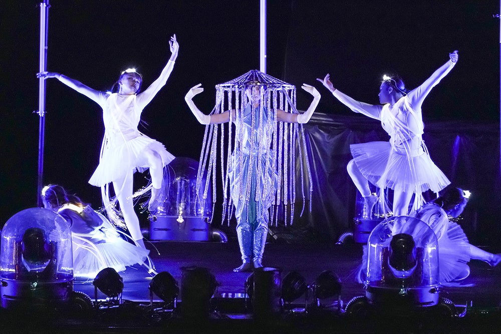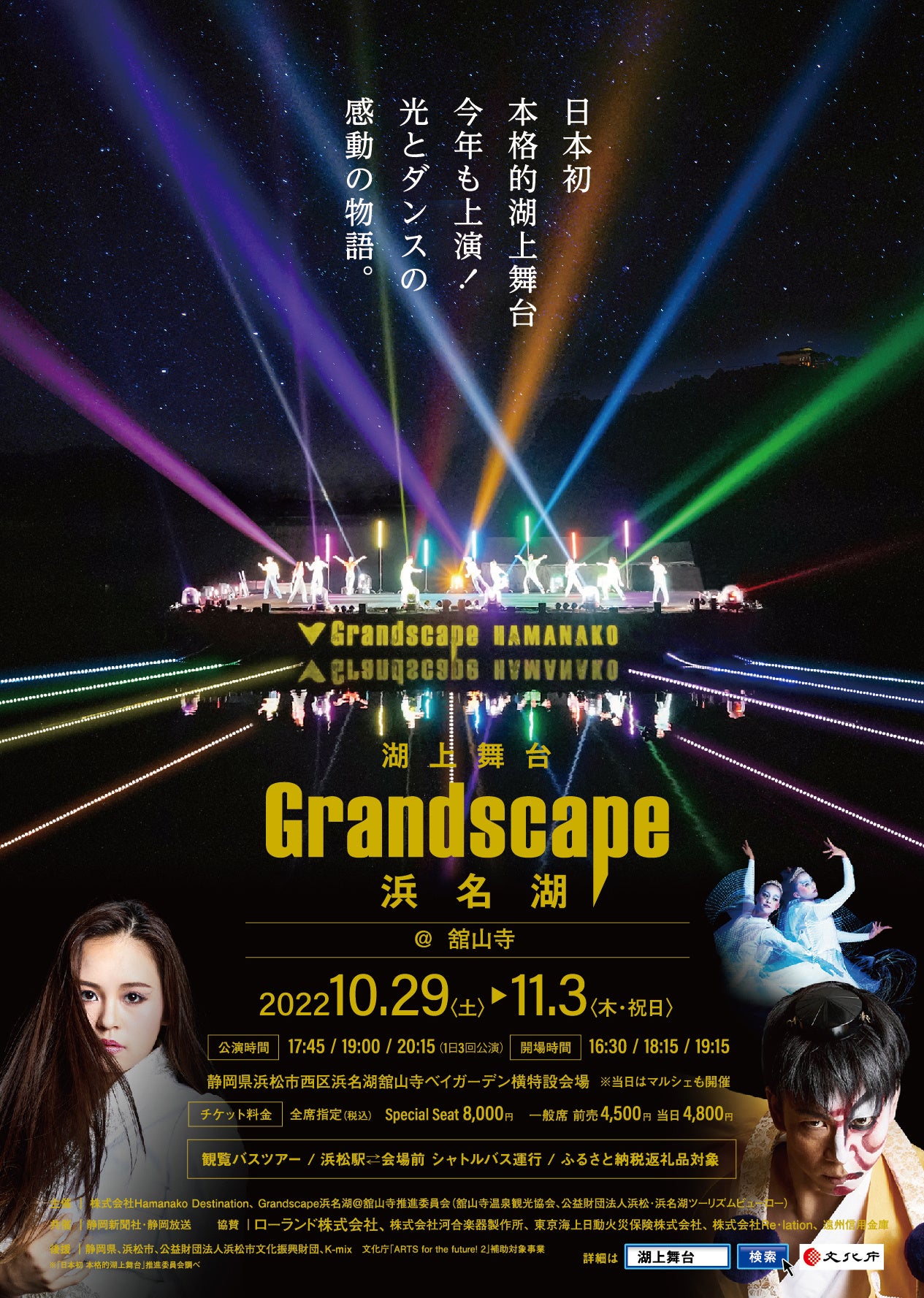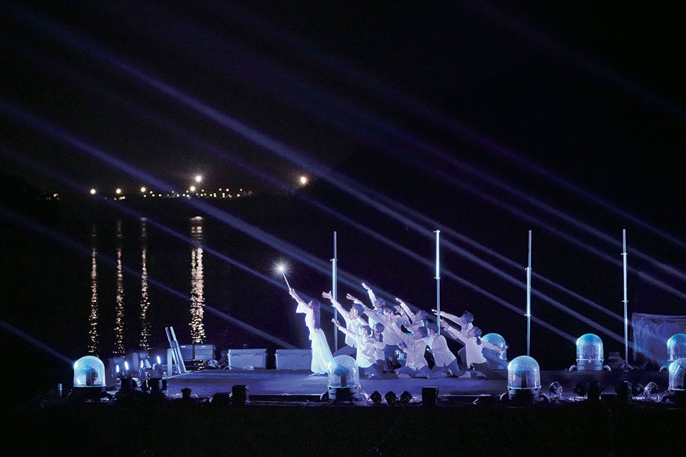 浜名湖に静寂が訪れると、湖上に光が灯り、Grandscapeの世界が幕を開けます。水面を活かした光や炎の演出と迫力あるダンス。遠江に棲む人々と自然との関わりを描いた感動の物語。今年は昨年の作品をさらに磨きをかけた演出でお届けします。湖岸の客席をスピーカーが囲み、エリアごとに分けた音響設計でサラウンド音響を実現しています。屋外とは思えない高品質な音楽、リアルな稲妻の音、鳥の囀り、火伏のクライマックスのシーンではぐるぐると周囲を巡る読経の声、臨場感にあふれる他に類を見ない特別な体験をお楽しみいただけます。業界第一線で活躍するクリエイターと若手プロ・ダンサーや作曲家、演奏家を抜擢。年に一度、優れた才能を持つアーティストたちが集結する質の高い芸術舞台をお見逃しなく!