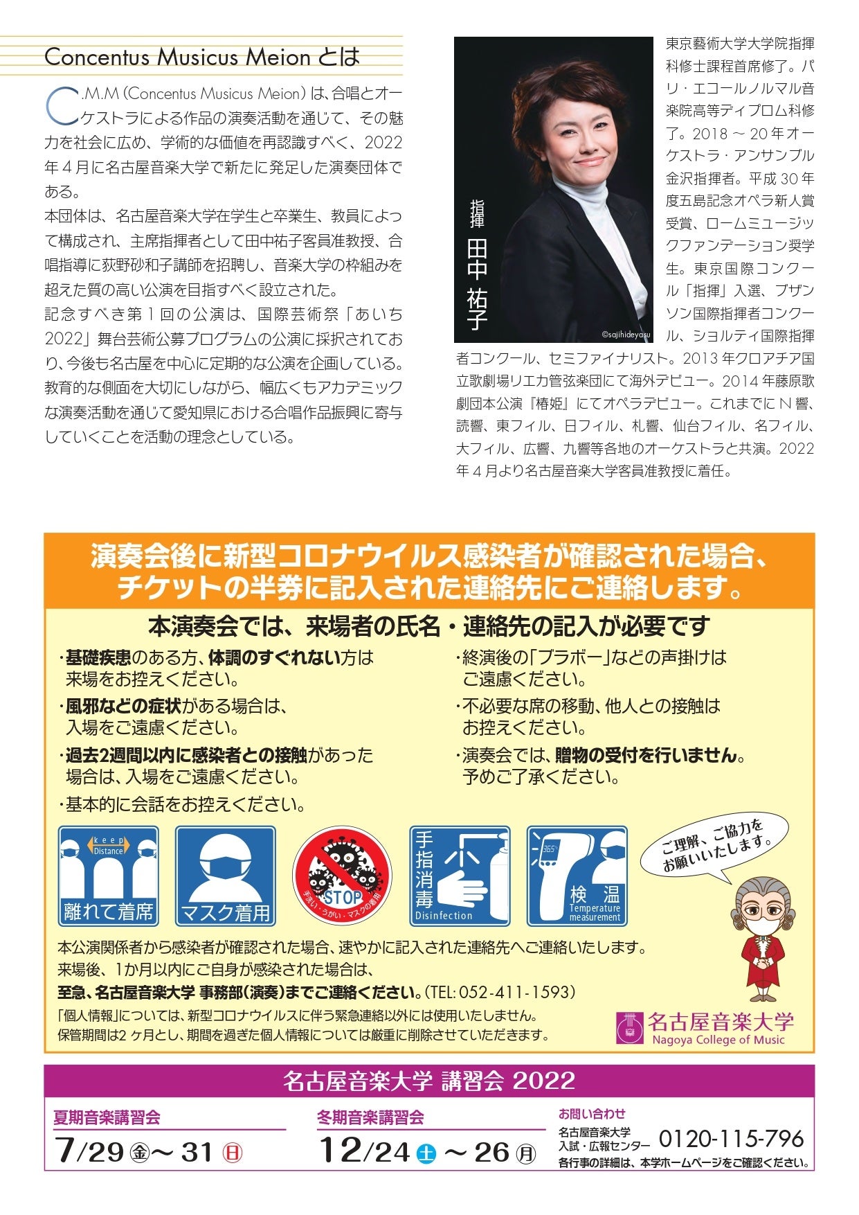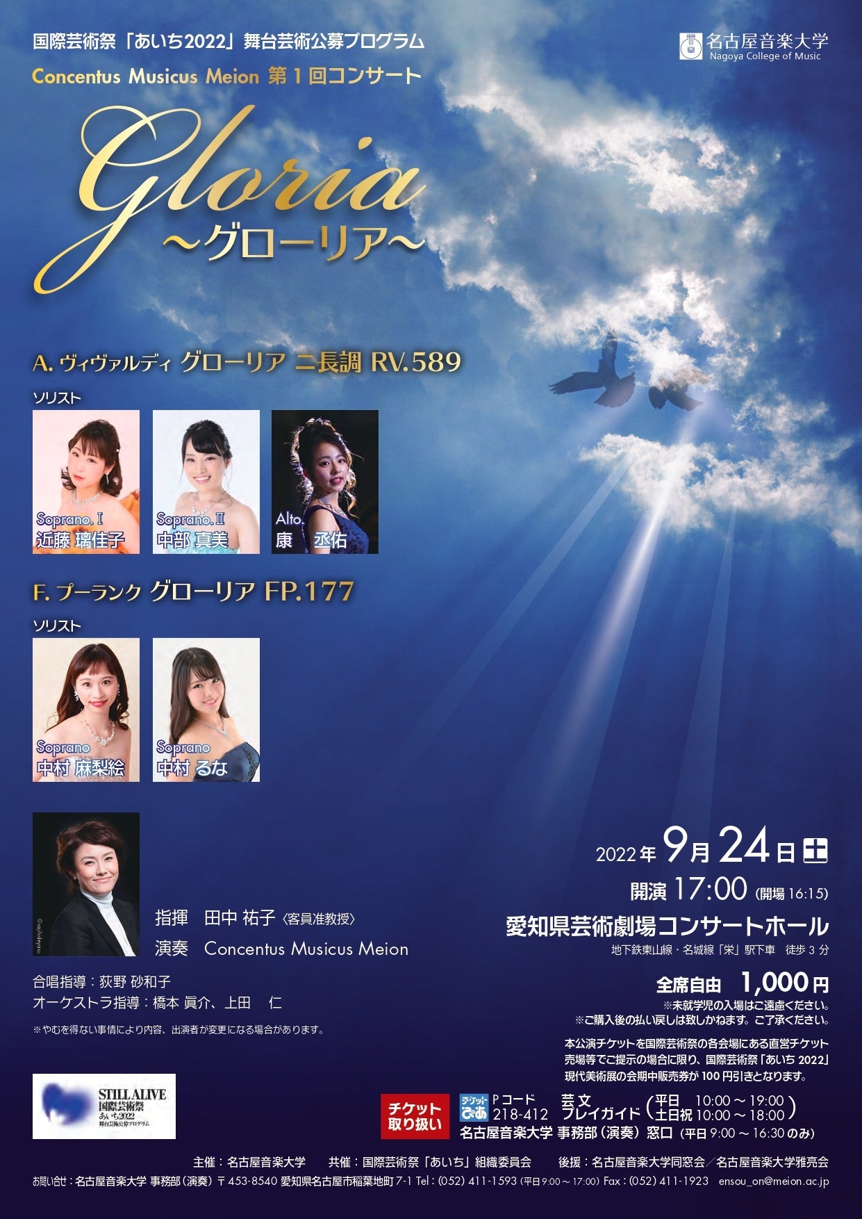 国際芸術祭「あいち2022」舞台芸術公募プログラムに採択された、Concentus Musicus Meion 第1回コンサート 『Gloria~グローリア~』の開催にあたり、コロナ禍で長く実施を延期してきた合唱普及振興の観点から、高校生以下の就学者の皆様を、無料ご招待とさせて頂きます。