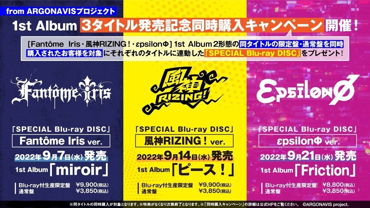 Fantôme Iris・風神RIZING!・εpsilonΦ 3バンドの各1st Album 2形態を対象に、同タイトルの限定盤・通常盤を同時購入されたお客様を対象にそれぞれのタイトルに連動した「SPECIAL Blu-ray DISC」をプレゼント!