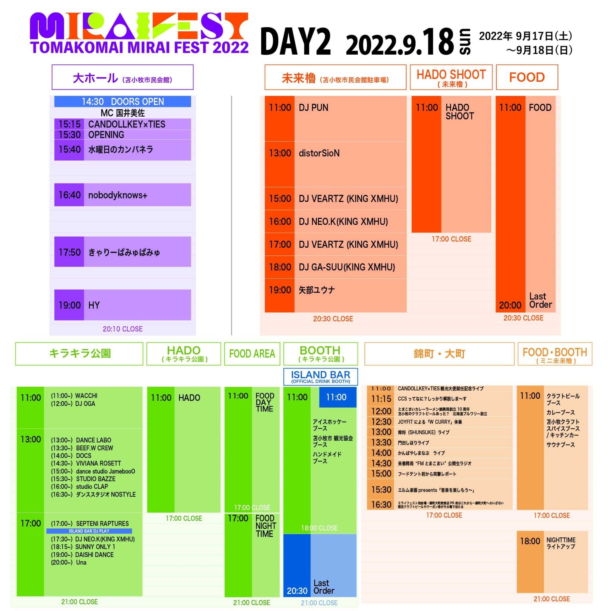 苫小牧市民会館 大ホールではLittle Glee MonsterやHYらが出演するライブパフォーマンス、苫小牧市民会館 駐車場ではSUNNY ONLY 1や矢部ユウナらゲストや道内で活躍するDJが未来櫓でDJパフォーマンス、キラキラ公園ではTOMOYUKI TANAKA(FPM)やDAISHI DANCEらゲストや苫小牧を中心に活動するアーティストによるパフォーマンス、錦町大町周辺ではCSS Hokkaidoとの共催で各種ステージプログラムが行われます。