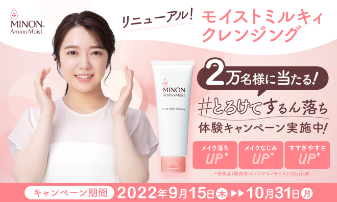 リニューアルした「ミノン アミノモイスト」のメイク落とし、「モイストミルキィ クレンジング」のサンプルに、TV-CMにも登場する、シリーズ内売上No.1*の乳液「モイストチャージ ミルク」もセットにしてプレゼント。