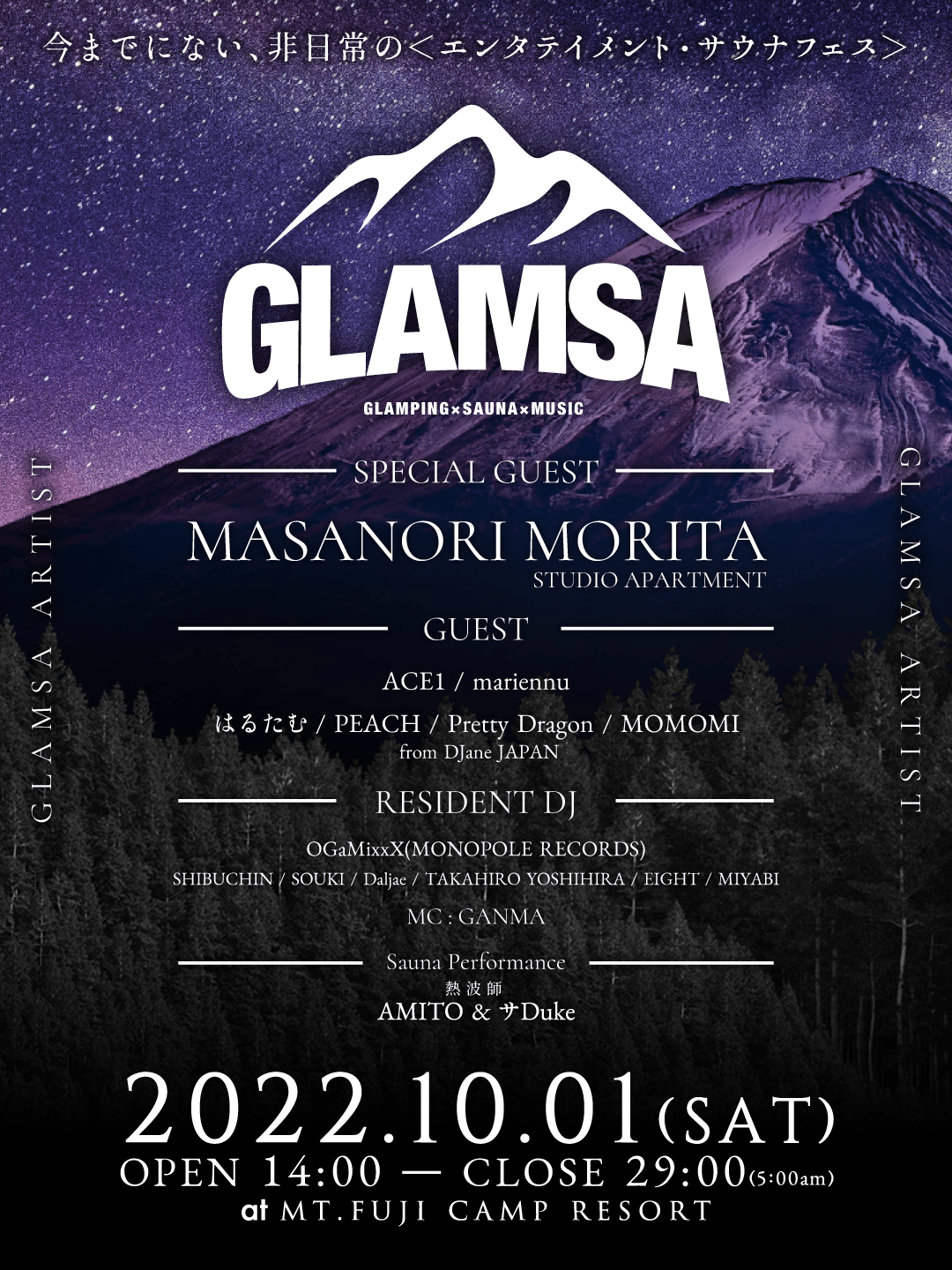 密を避けながら手軽にキャンプを楽しめる”グランピング”は、年々市場規模が拡大しております。また、コロナ渦で生活環境が変わり、心とからだを「整えたい」というニーズの高まりから、”サウナ“の人気も高まっています。そのような中、”グランピング“と”サウナ“の両方を楽しむことができる空間を創り出したいと考え、”グランピング“(GLAMPING)と”サウナ“(SAUNA)を掛け合わせた造語「GLAMSA」が誕生しました。大自然の中で、”グランピング”をしながら、”サウナ“で整い、極上の”最先端サウンド“も堪能できる史上初の”オールナイトサウナフェス”として最高のエンターテイメントをお届けします。