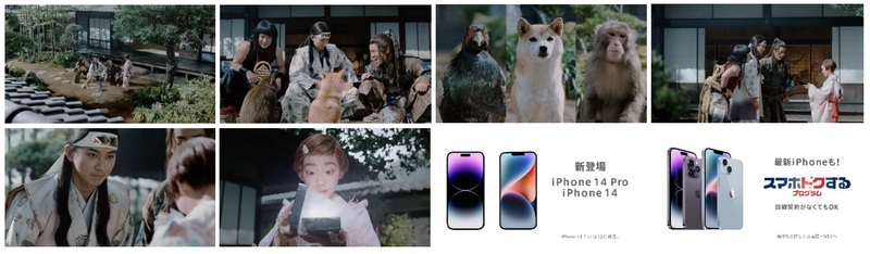 本CMは桃姫(村山輝星さん)が桃太郎(松田翔太さん)にお供が欲しいとおねだりするストーリー。桃太郎のお供である動物たちの中からオススメを聞く浦島太郎(桐谷健太さん)と金太郎(濱田岳さん)。しかし桃太郎は「桃姫には最新のお供!」と言い、「愛」と書かれた箱を渡します。中からまぶしく光り輝く何かに、「この愛、すごいね・・・」と圧倒される桃姫なのでした。そんな愛がつまった最新のお供を通して、新登場する『iPhone 14 Pro・ iPhone 14 』と、最新のiPhoneもいきなりおトクになる『スマホトクするプログラム』を訴求します。