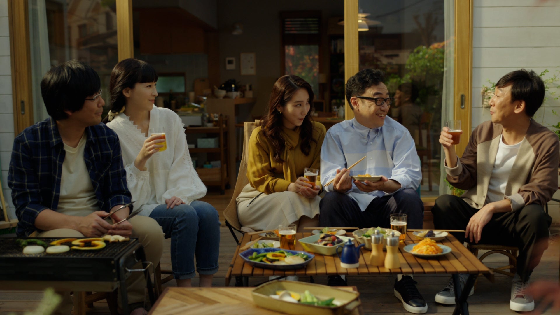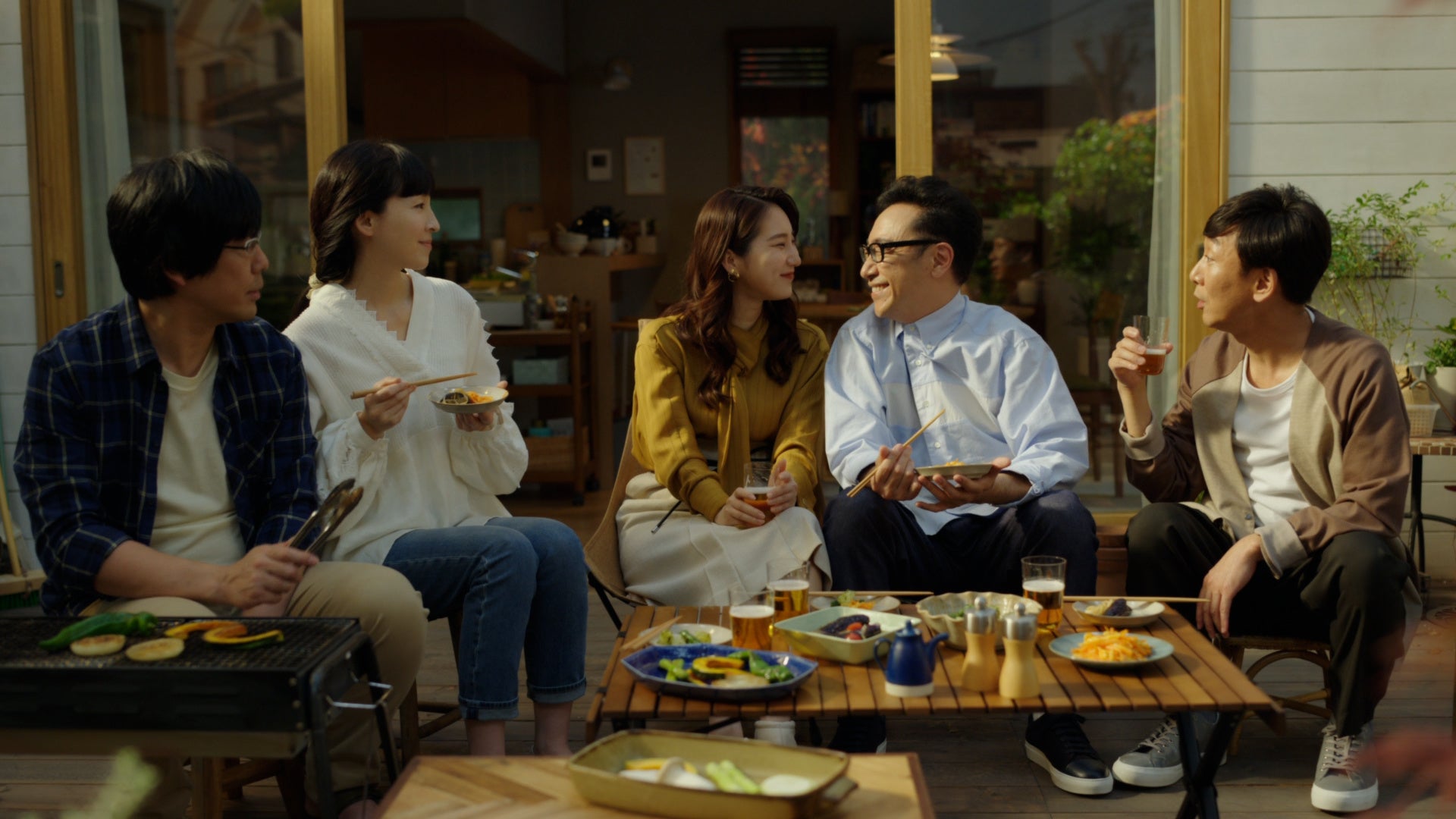 撮影前の挨拶で「いつも見ていたCMに参加できるのが嬉しいです」と話すウイカさん。監督からのアドバイスをうまく吸収し、スムーズに撮影が進みます。飯塚さんが「良い意味での異物感が面白い」と話すように、既に出来上がっている4人の世界観に溶け込みつつ、しっかり存在感を放っていました。撮影前は「うまく馴染めるか心配」と言っていましたが、麻生さんと談笑する様子や東京03の皆さんとセットの料理を楽しむ姿が見られ、すっかり馴染んでいました。